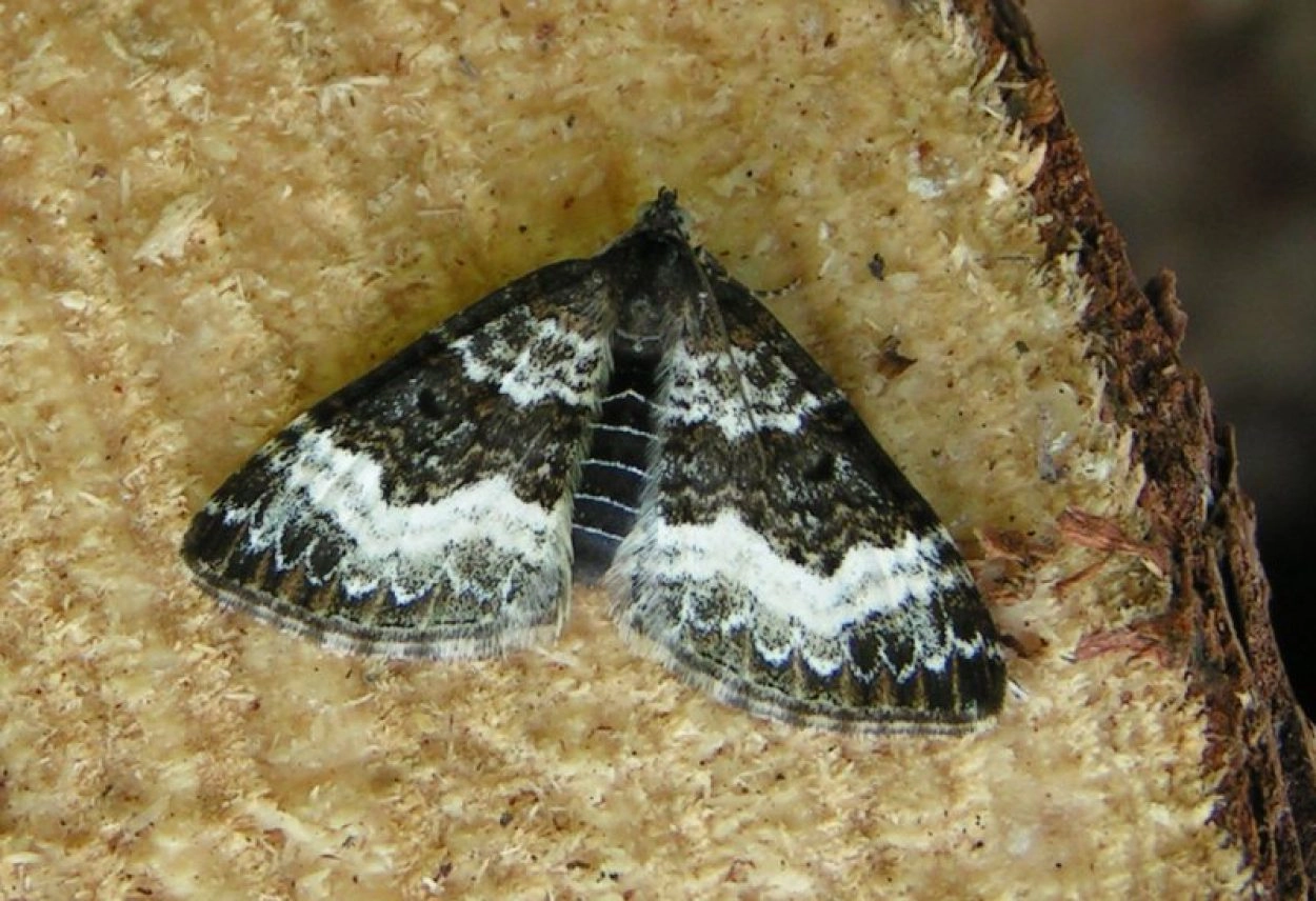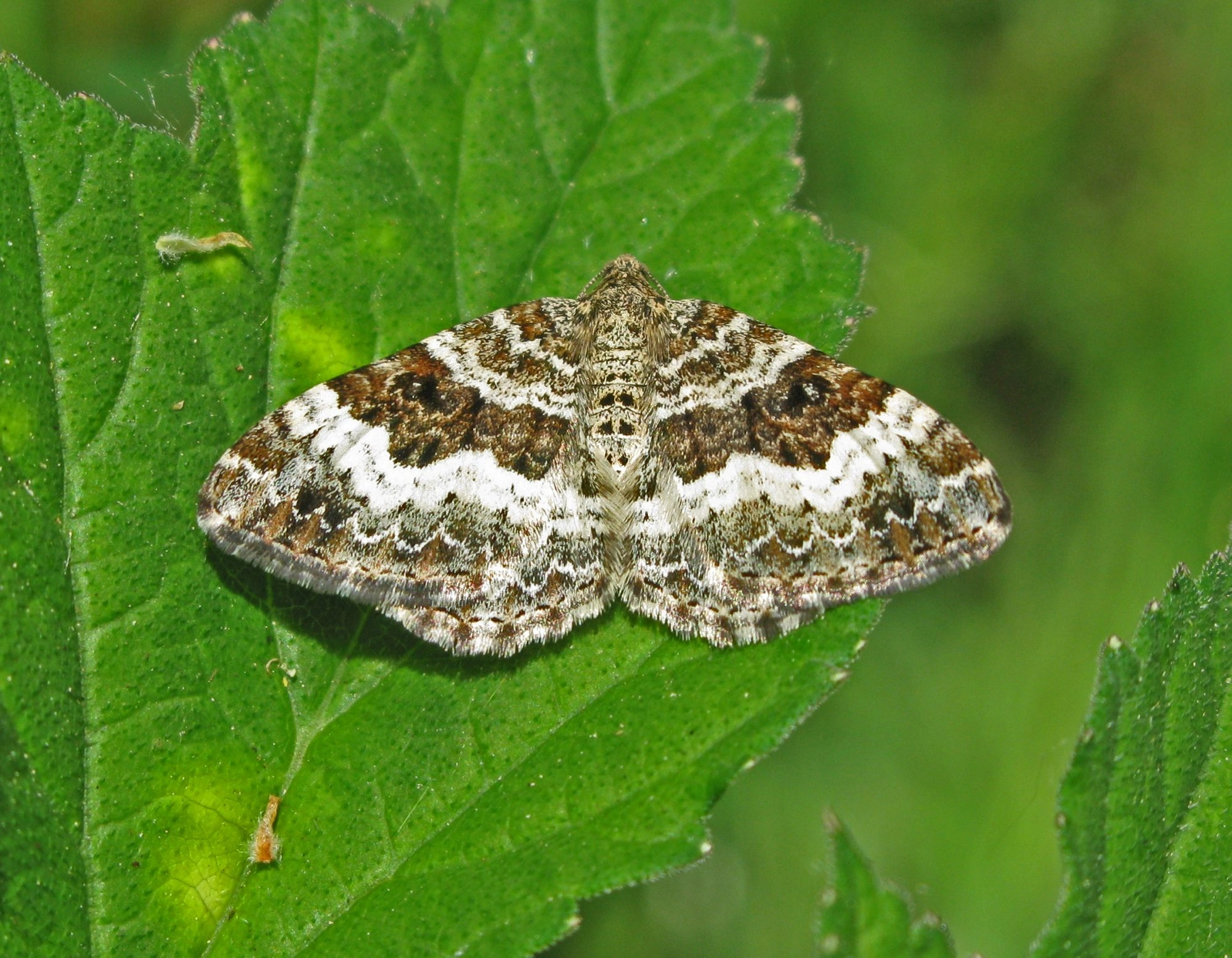 Bosbandspanner (Epirrhoe rivata).N.B.: vergelijk behalve de uiterlijke kenmerken ook de tijd van het jaar waarin de rupsen voorkomen, het habitat en de waardplant(en).