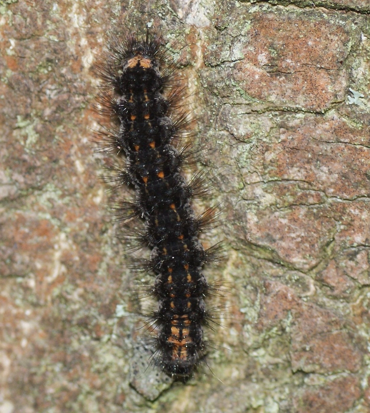 Tot 25 mm; lichaam aan de bovenzijde fluweelzwart, aan de onderzijde zwartachtig bruin, overdekt met grijze haartjes, die op kleine verheven wratjes staan ingeplant; over de rug twee oranje lengtestrepen, soms tot een rij oranje vlekjes gebroken; kop glimmend zwart.