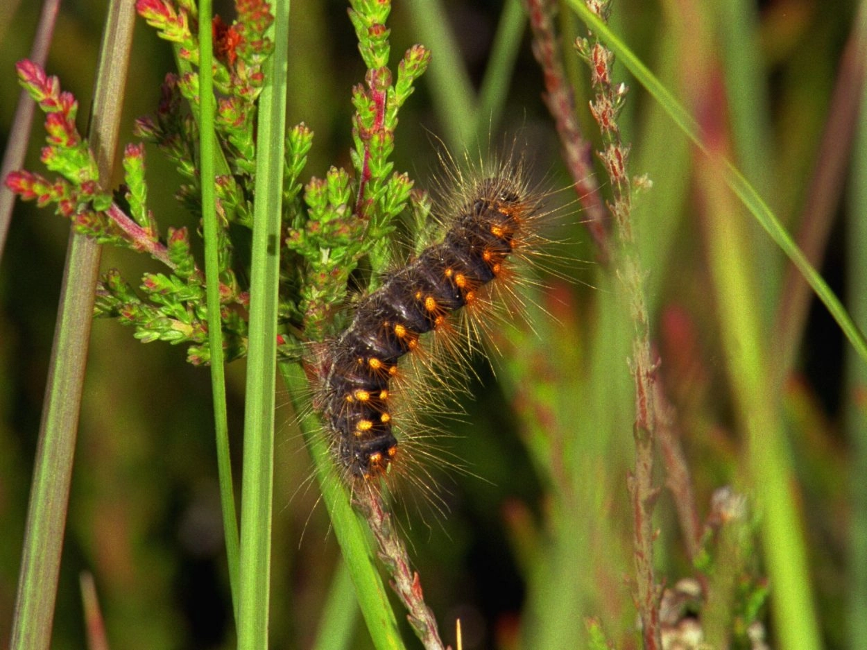 Tot 40 mm; lichaam donkergrijs met fluweelzwarte dwarsbanden op de rugzijde; elke dwarsband met vier oranjerode vlekken, waarop roodachtige haarborstels staan ingeplant; spiracula wit met zwarte rand; kop glimmend zwart.