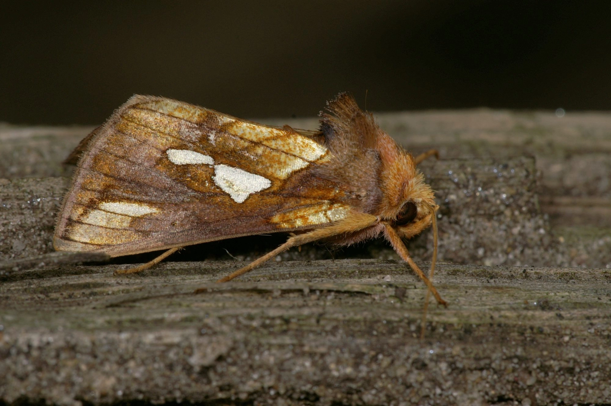 Voorvleugellengte: 14-19 mm. Net als de verwante soorten houdt deze uil in rust de vleugels dakvormig omhoog. Op de bovenkant van het borststuk bevindt zich een opvallende kuif. De voorvleugel heeft een oranjebruine of warmbruine met goudgele grondkleur en is bestrooid met fijne bruine spikkels. Over de vleugel lopen enkele vage schuine donkere dwarslijnen. Opvallend is de zilverkleurige dubbele vlek in het midden van de voorvleugel. Deze dubbele vlek is variabel van vorm; het vlekje dat het dichtst bij de achterrand ligt is altijd kleiner en ellips- of druppelvormig. Heel soms zijn beide vlekken met elkaar versmolten. In de vleugelpunt ligt een eveneens opvallende lichte, deels zilverkleurige, vlek die door de donkere aders in vier vlakjes is opgedeeld. Het langste vlakje, dat het verst van de vleugelpunt af ligt, is zuiver zilverwit van kleur en heeft een spitse, naar binnen wijzende punt. Het direct daaraan grenzende vlakje is witachtig tot licht goudkleurig, soms ook gedeeltelijk zilverkleurig; de twee kleinste, dichtst bij de vleugelpunt gelegen vlakjes zijn iets donkerder goudkleurig.