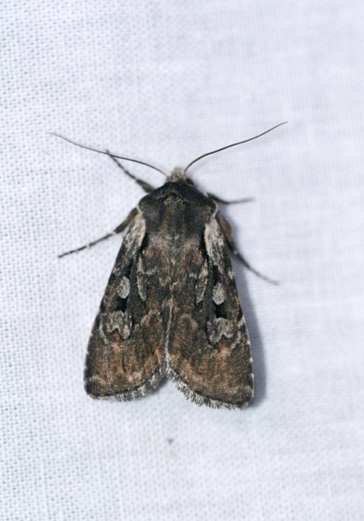 Voorvleugellengte: 16-18 mm. De vleugelwortel van de voorvleugel heeft langs de voorrand een lichte vlek, waardoor de dikke zwartachtige wortelstreep goed opvalt. De rest van de voorvleugel is bruinachtig grijs tot zeer donker, bijna zwartachtig grijs van kleur. Vooral lichtgrijze exemplaren maken een sterk bestoven indruk. De uilvlekken, die altijd lichter grijs zijn dan de rest van de vleugel, vallen duidelijk op. De ringvlek ligt in een geheel of gedeeltelijk wigvormig zwart vlak. De achtervleugel is licht gekleurd met donkerdere aders en de bovenzijde van het borststuk is opvallend donker. Soms komen donkerdere, minder contrastrijk getekende exemplaren voor.
