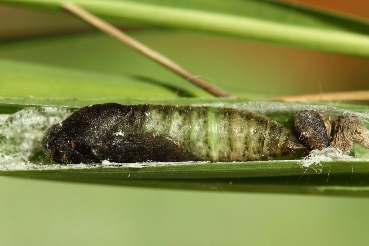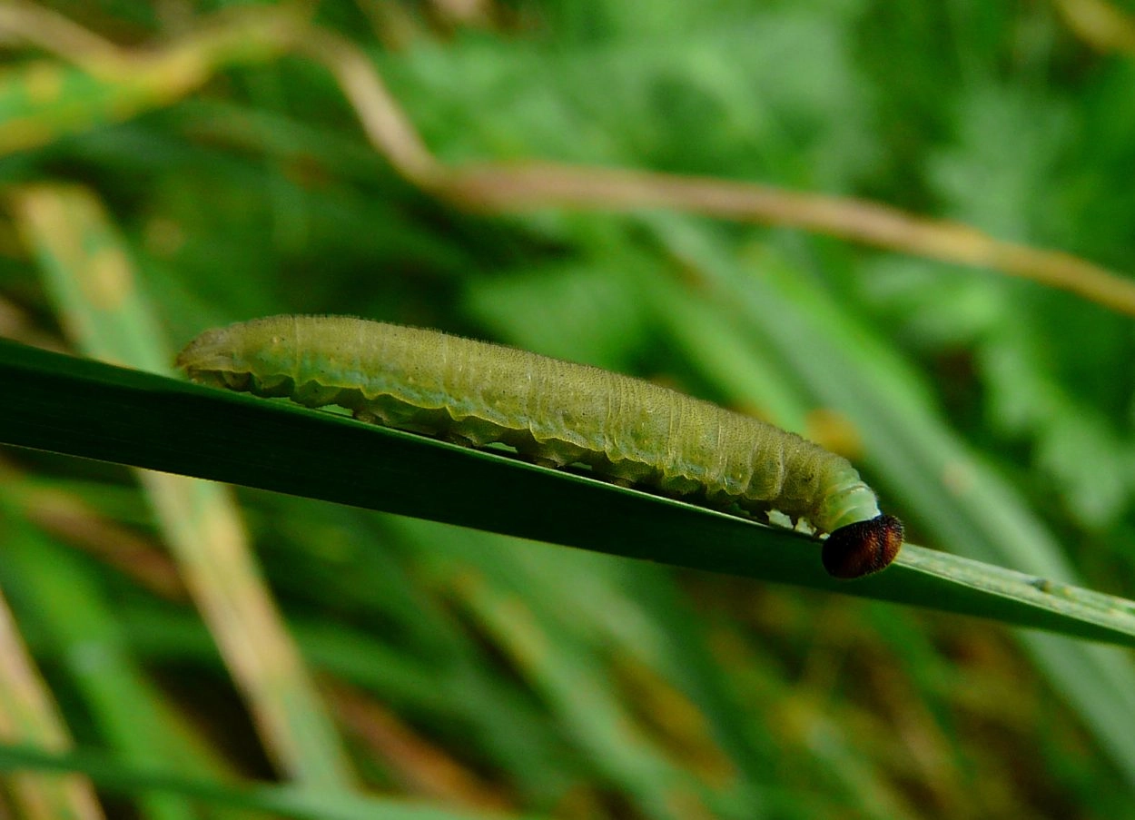De rups eet na het uitkomen eerst de eischaal en bouwt vervolgens een koker door zijden draden van de ene naar de andere rand van het blad te spinnen. De binnenzijde van deze koker bekleedt hij met een laagje zijde. De rups kruipt alleen uit dit onderkomen om van de rand van de grasstengel te eten en keert er na iedere maaltijd weer in terug. Na elke vervelling maakt hij een nieuwe koker. Voor de overwintering spint de halfvolgroeide rups een stevig hibernaculum in een grasstengel. Dan zit de rups diep weggestopt in een dichtgevouwen blad. In het voorjaar eet de rups verder. Om zich te verpoppen spint hij vlak boven de grond een cocon tussen enkele grassprieten.