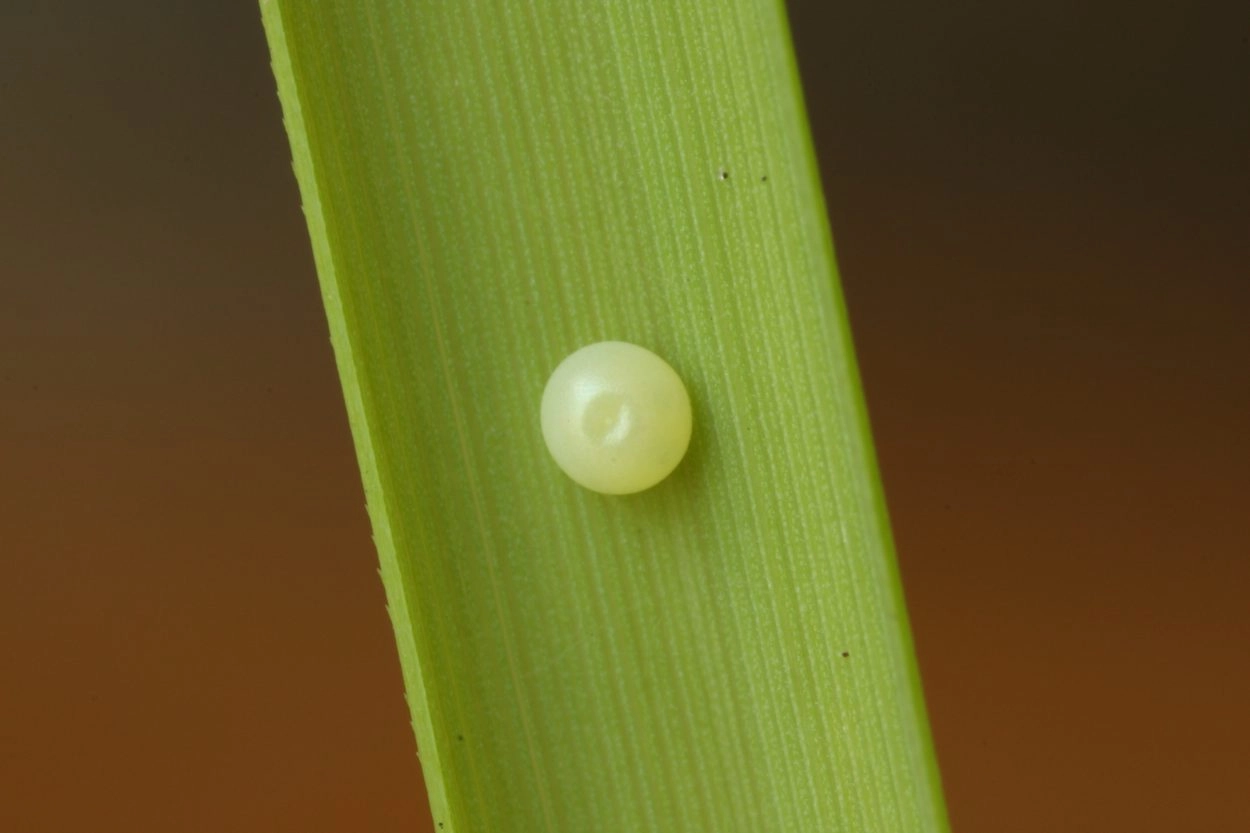 Een vrouwtje dat op zoek is naar een geschikte plaats om de eitjes af te zetten, vliegt laag boven de vegetatie. Wanneer een geschikte plant is gevonden, gaat ze op een van de buitenste bladeren zitten en zet aan de onderzijde één eitje af. De meeste eitjes worden afgezet op beschutte plaatsen in een vrij hoge grazige vegetatie.