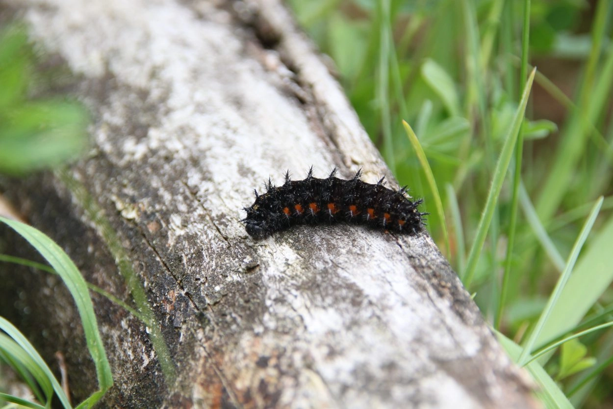 Tot 38 mm; lichaam fluweelzwart met zwarte doorns en onder de spiracula een rij oranjerode vlekken; kop glimmend zwart.