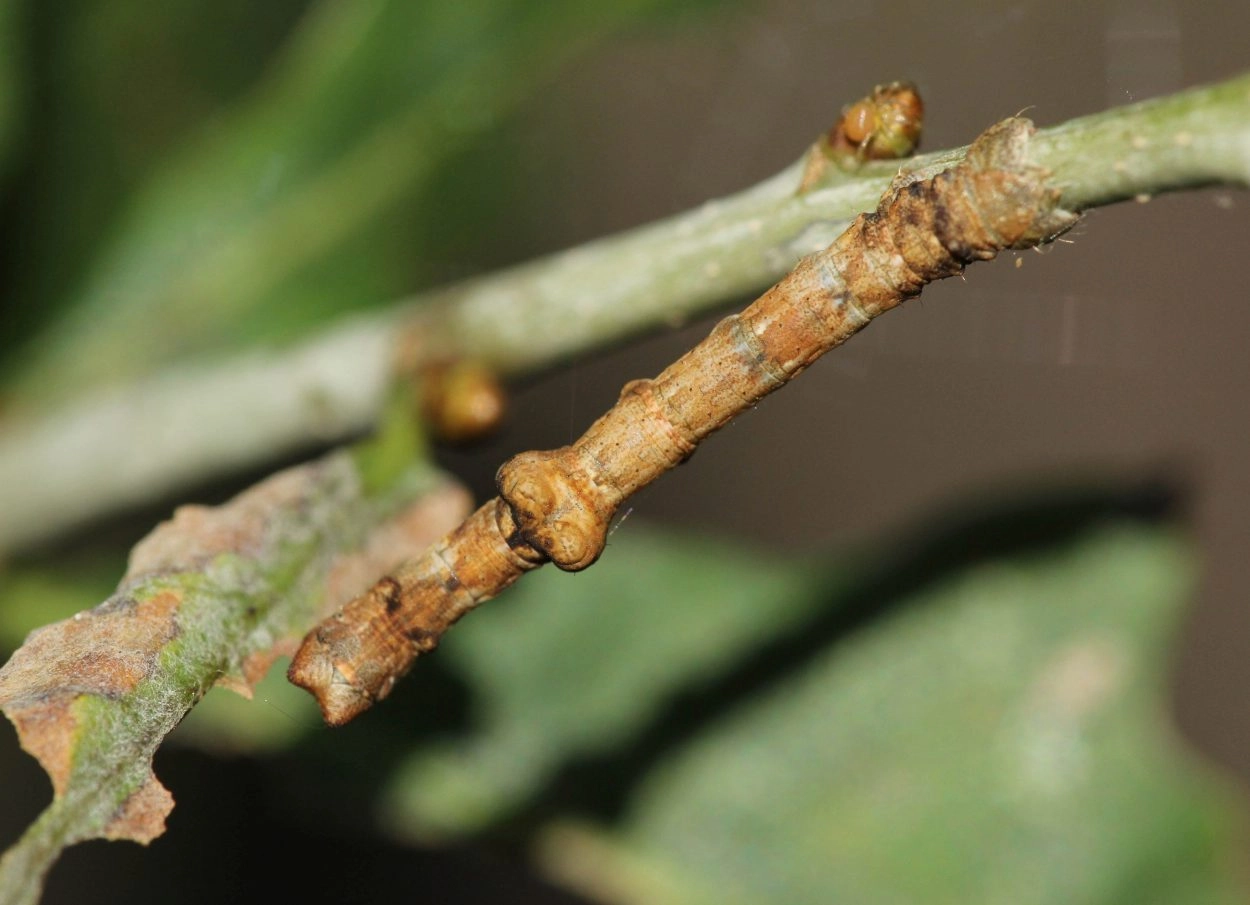 Tot 50 mm; vrij dik; lichaam roodachtig bruin, soms met okerachtig bruine tekening; op de rugzijde van segment vijf en elf een paar grijsachtige bultjes; segment zes met een zwelling aan de onderzijde; kop bruin, ingesneden.