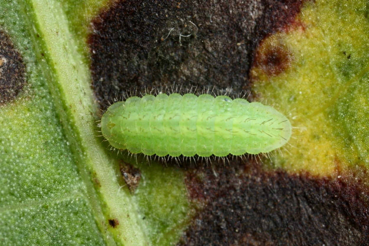 Tot 21 mm; plomp, versmald naar de uiteinden; lichaam helder groen met kleine, witte, bultige vlekjes; over de rug slechts een aanduiding van een donkere lengtestreep en op de flanken dondere, schuine strepen; kop klein, licht okerachtig groen, in rust in het lichaam teruggetrokken.
