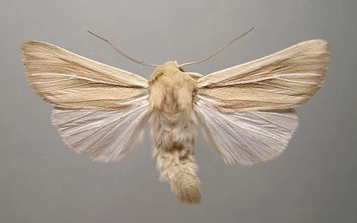 Voorvleugellengte: 15-18 mm. Kenmerkend is de opvallende witte hoofdader met de witte vertakkingen, die vanaf de vleugelwortel tot aan de achterrand zichtbaar is. De grondkleur van de voorvleugel is strokleurig tot geelachtig bruin; langs de voorrand echter lichter en rond de witte aders juist donkerder gekleurd. De achtervleugel is glanzend wit.