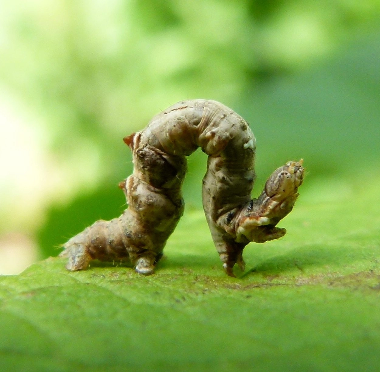 Tot 39 mm; lichaam geelachtig bruin tot bruin, variërend roodachtig bruin en donker purperachtig bruin getekend; het derde paar poten van de thorax is gezwollen en bootst de knop van een twijg na; op de rugzijde van de gezwollen segmenten zeven en acht een dubbele kegelvormige uitwas; kop bruin of grijsachtig bruin met witte tekening.