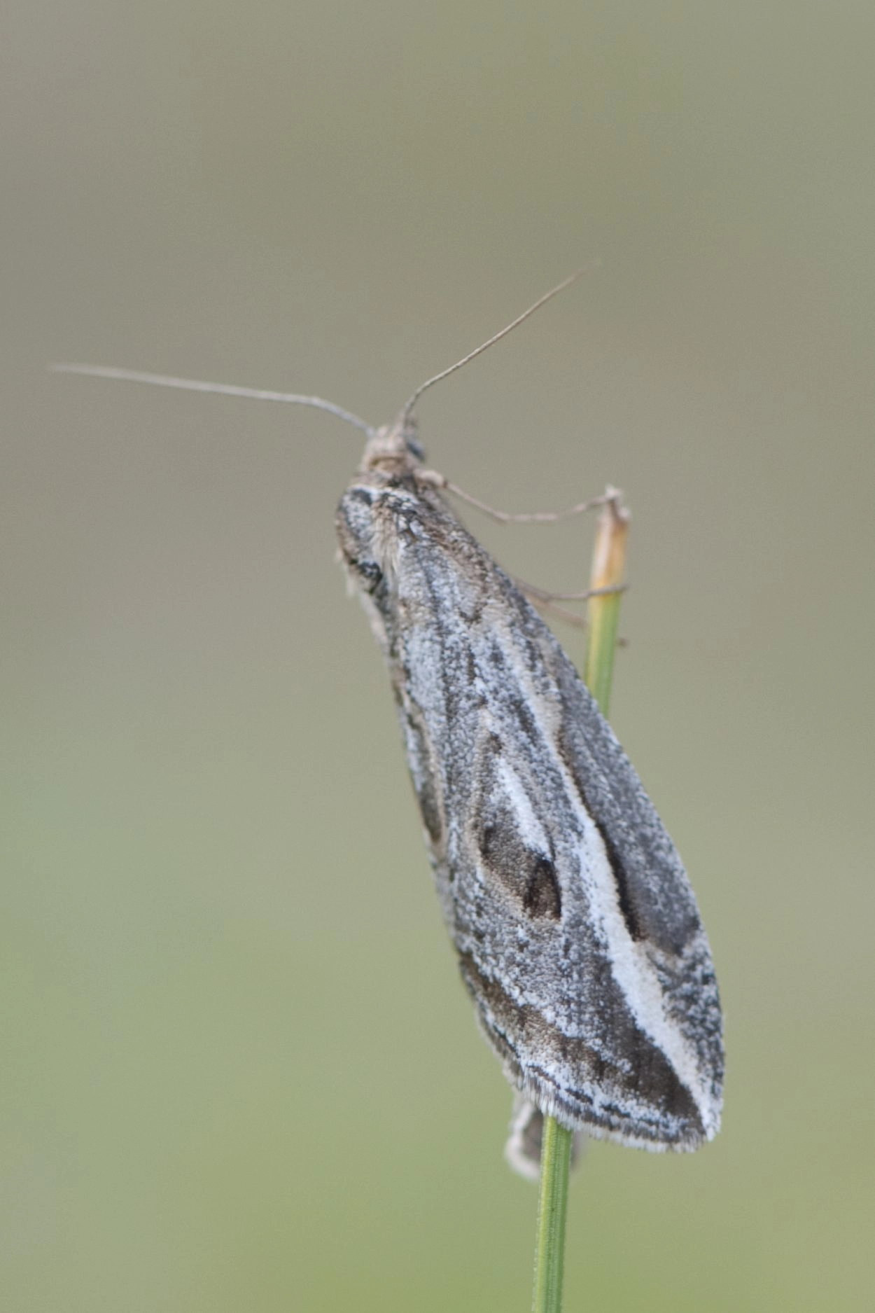 Voorvleugellengte: 17-19 mm. De vleugels van deze spanner zijn lang en spits; in rust worden ze dakvormig over elkaar heen gevouwen rond het lichaam. De grondkleur van de voorvleugel varieert van donker bruinachtig grijs tot lichter grijs. Kenmerkend zijn de lange bleke streep langs de voorrand en de twee grote ovale licht geringde vlekken.