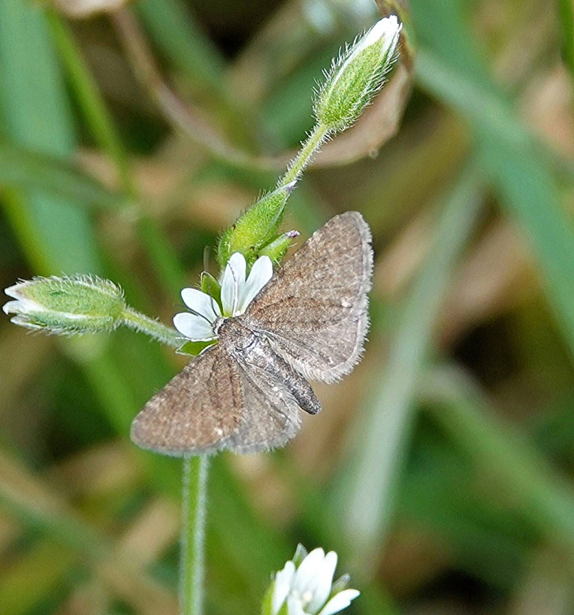 Voorvleugellengte: 8-9 mm. Een van de kleinste van de dwergspanners die in Nederland voorkomen; herkenbaar aan de bijna chocoladebruine grondkleur. De voorrand van de voorvleugel is tamelijk recht en de vleugelpunt is vrij spits. Soms is een duidelijke vleugeltekening aanwezig, vooral aan de voorrand, maar de vlinders zijn meestal grotendeels ongetekend, soms egaal zonder grijs. In de binnenrandhoek ligt een witte stip en in enkele gevallen is zelfs een lichte golflijn aanwezig. De franje is gewoonlijk bruin en wit geblokt.