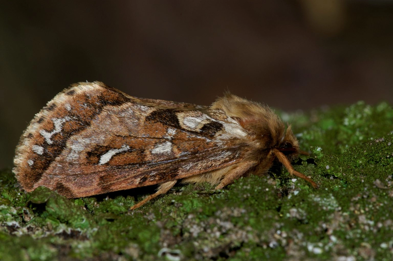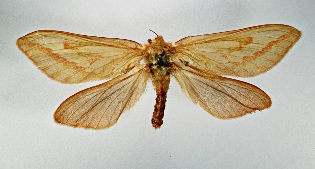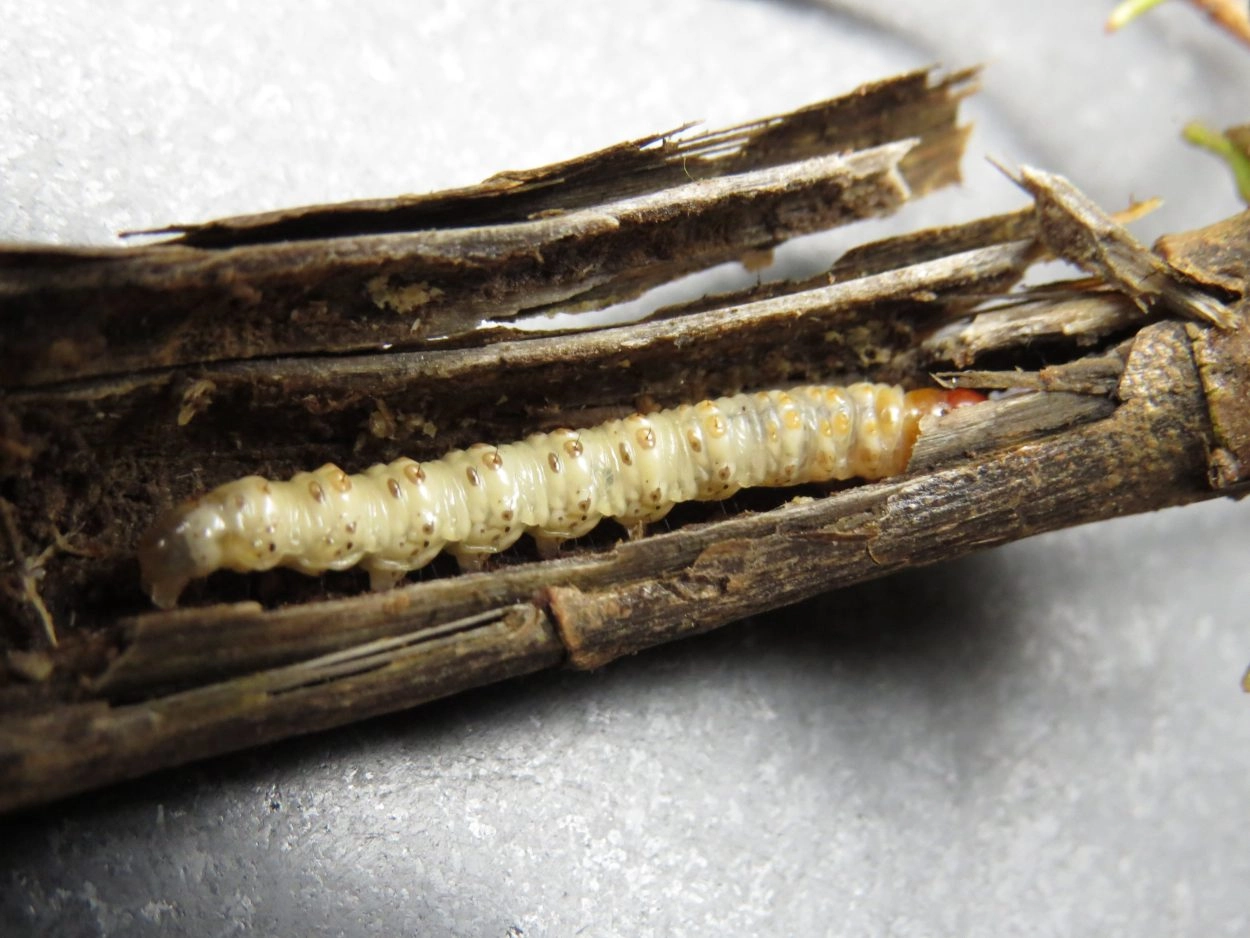 28-32 mm. Het lijf glimt en is vuilwit; de kop is roodachtig bruin en glimt ook; de nekplaat is oranjebruin en de rups heeft ook chitineachtige plaatjes liggend op het lijf; stigma’s zijn zeer donkerbruin.