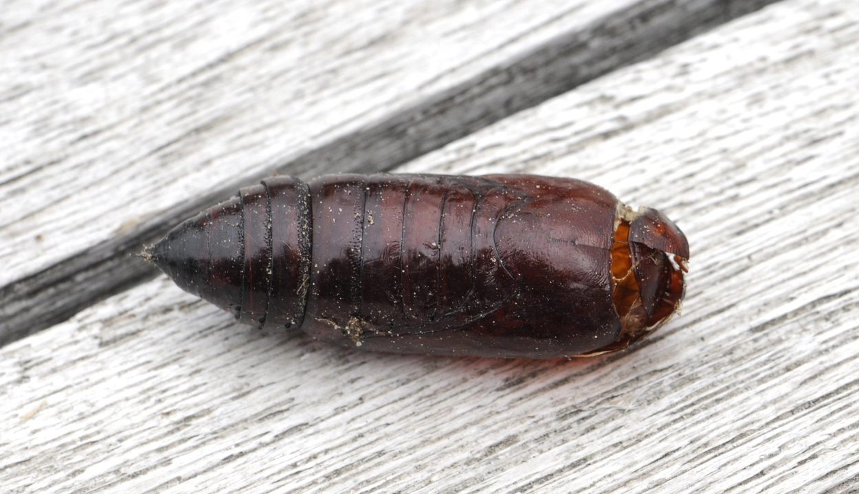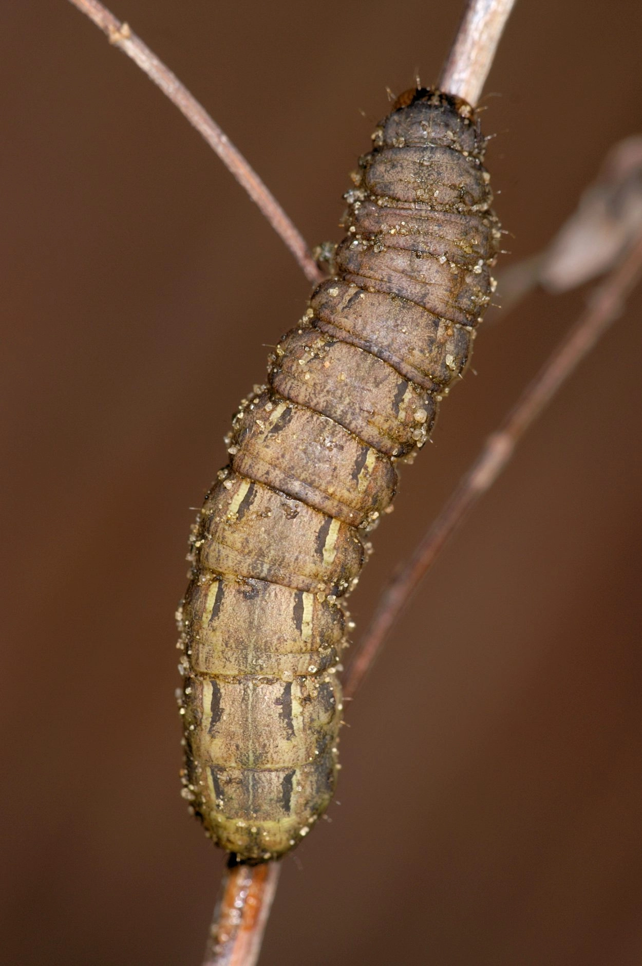 Tot 50 mm; lichaam zeer variabel in kleur, variërend van okerkleurig tot verschillende nuances bruin of zelfs helder groen; het duidelijkste kenmerk is de dubbele rij donkerbruine of zwarte langsbalken over de rug, die aan de buitenzijde witachtig bruin of groen gezoomd zijn; over de spiracula loopt ook een rij donkere vlekken; kop lichtbruin met donkerbruine vlekjes en streepjes.