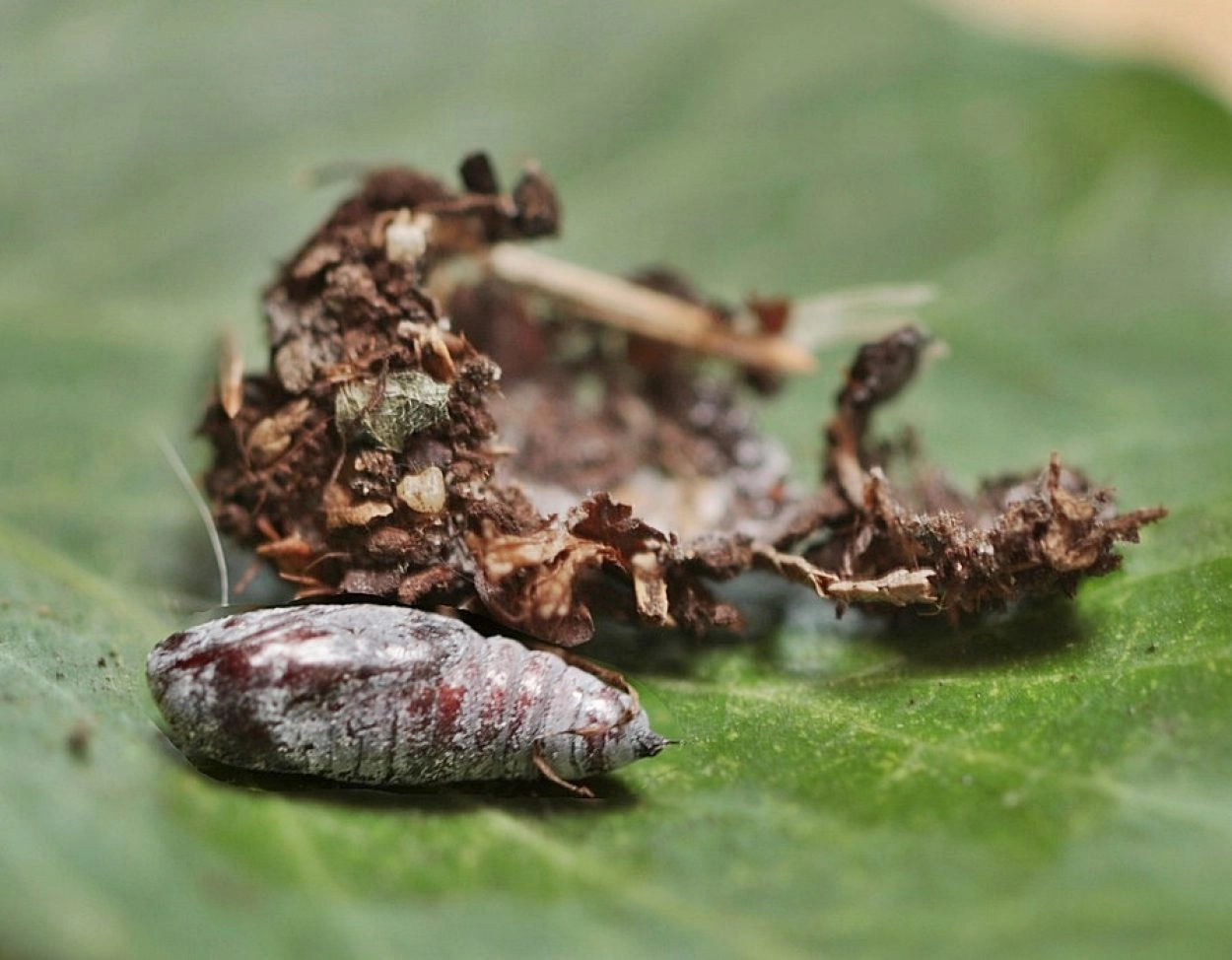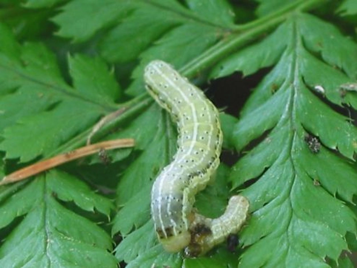 Tot 28 mm; lichaam helder groen met zwartgekernde, witte vlekjes en smalle, geelachtige ringen tussen de segmenten; over de rug een brede, geelachtig witte middenband met aan weerszijden een fijne gebroken lengtestreep; langs de spiracula een brede geelachtig witte lengteband met groene zweem en soms een zwartachtig groene zoom langs de bovenrand; kop lichtgroen.