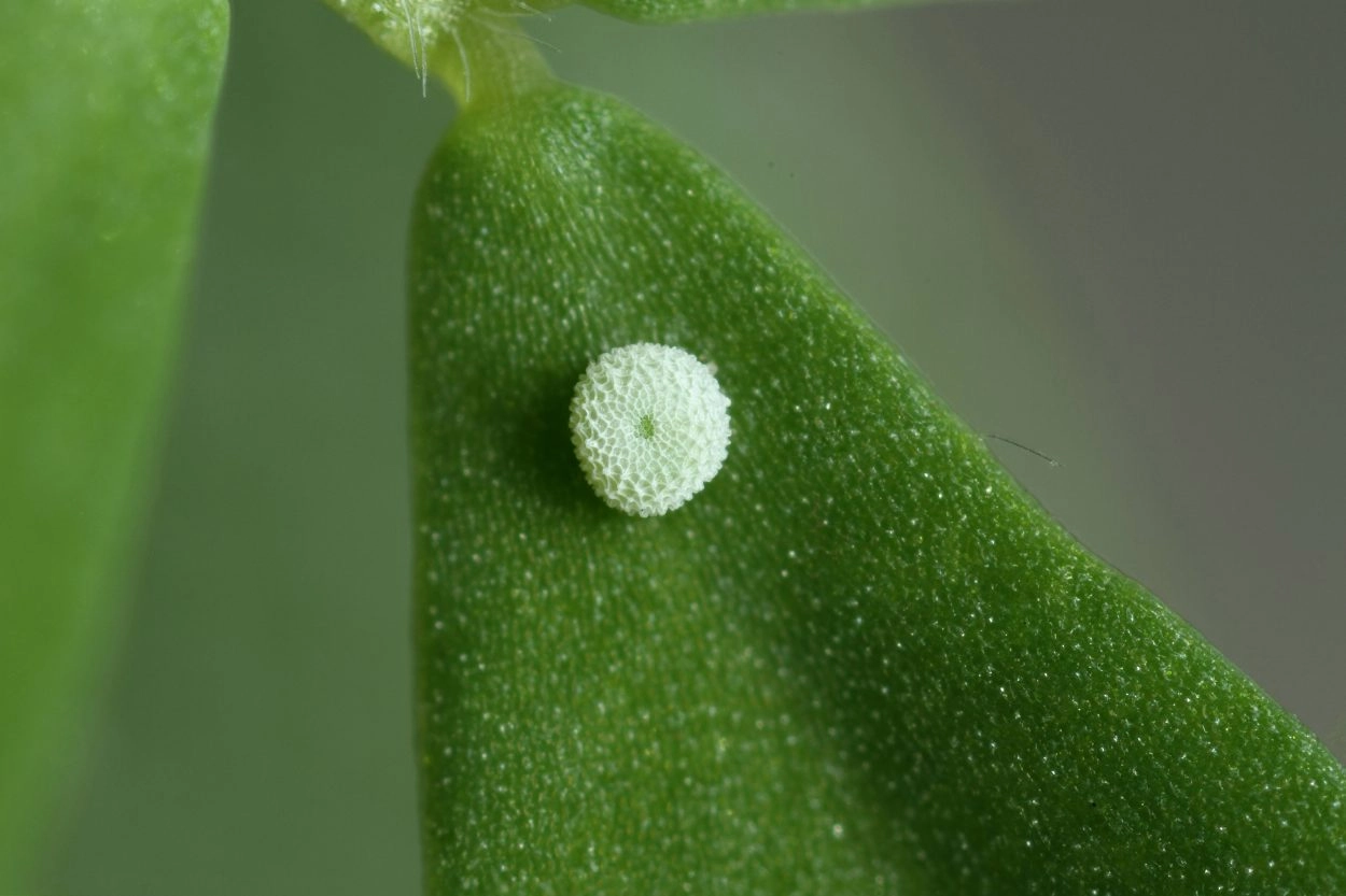Het vrouwtje zet de eitjes afzonderlijk af op de bovenzijde en aan de basis van jonge bladeren aan de top van een plant. De gekozen planten staan doorgaans in een korte vegetatie met meerdere bijeen. Vrouwtjes van de eerste generatie zetten de eitjes vooral af op kleine klaver, vrouwtjes van latere generaties gebruiken met name rolklaver.