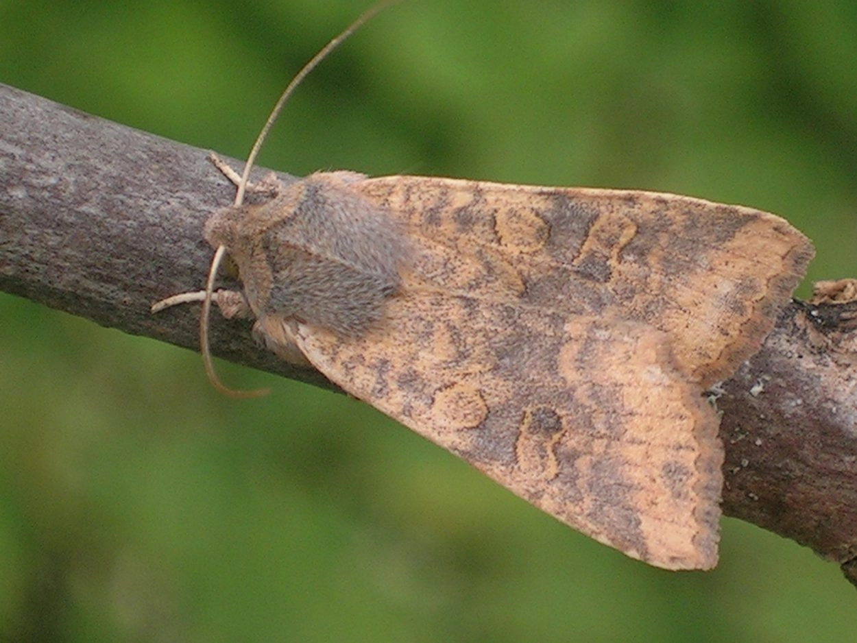 Voorvleugellengte: 15-18 mm. De dof oranjegele of oranjebruine voorvleugel met vaak een afgeronde punt heeft een zwartachtig grijs of donkerbruin vlekkerig bandenpatroon en een fijne donkere spikkeling. Het bandenpatroon is soms gereduceerd tot enkele donkere vlekken en onduidelijke dwarslijnen. Soms komen exemplaren voor met een extra brede diffuse dwarsband op de grens van het midden- en zoomveld en één in het wortelveld. De binnenste lob van de niervlek is donker gevuld. De achtervleugel is witachtig, bij de binnenrandhoek soms wat donkerder.