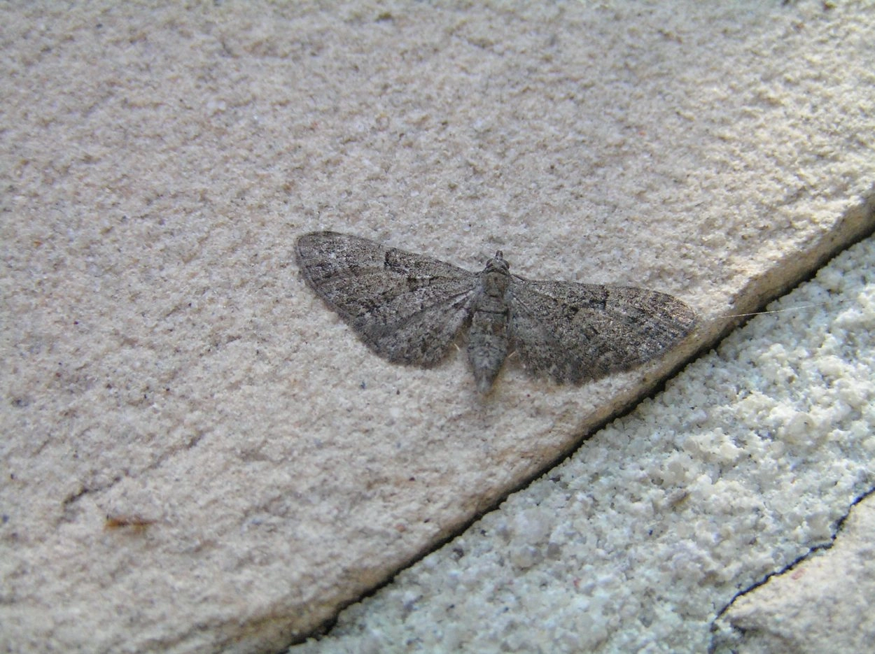 Voorvleugellengte: 9-11 mm. Een zeer variabele dwergspanner, die echter te herkennen is aan de witachtige of lichtbruine vlek aan de buitenzijde van de middenstip. De buitenrand van de middenband is aan de binnenzijde bezet met zwarte pijlvlekjes van verschillende lengte; de twee vlekjes tussen de middenstip en de vleugelpunt zijn het langst en vallen het meest op. De dwarslijnen variëren in intensiteit en zijn ter hoogte van de middenstip scherp gehoekt; door de middenband loopt een dwarslijn die gewoonlijk door de middenstip loopt. De grondkleur van de voorvleugel varieert van witachtig bruin tot donkerbruin of grijs. Over het midden van de zwak getekende achtervleugel loopt een donkere dwarslijn die vooral bij de binnenrand duidelijk zichtbaar is; vaak is nog een tweede dwarslijn aanwezig vlak voor de vleugelwortel.