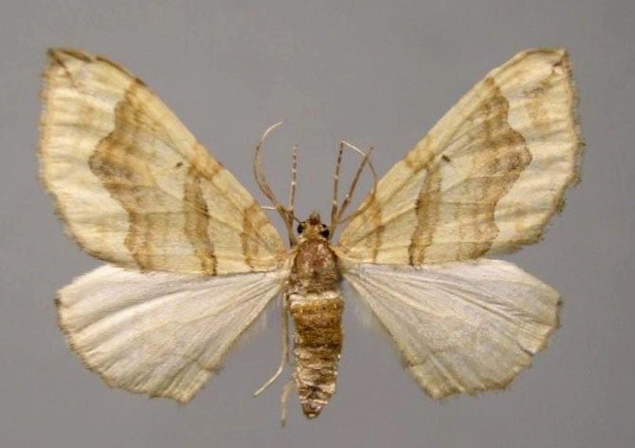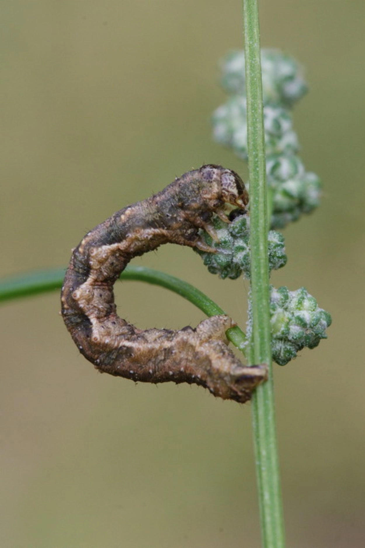 Tot 23 mm; lichaam vrij dik met ruwe huid; bleek okerkleurig, soms met roze zweem, zwaar getekend met grijsachtig zwart boven de spiracula; een duidelijke brede zigzagstreep langs de flanken en donkere chevrons op de rug; kop witachtig met roodbruine tekening.