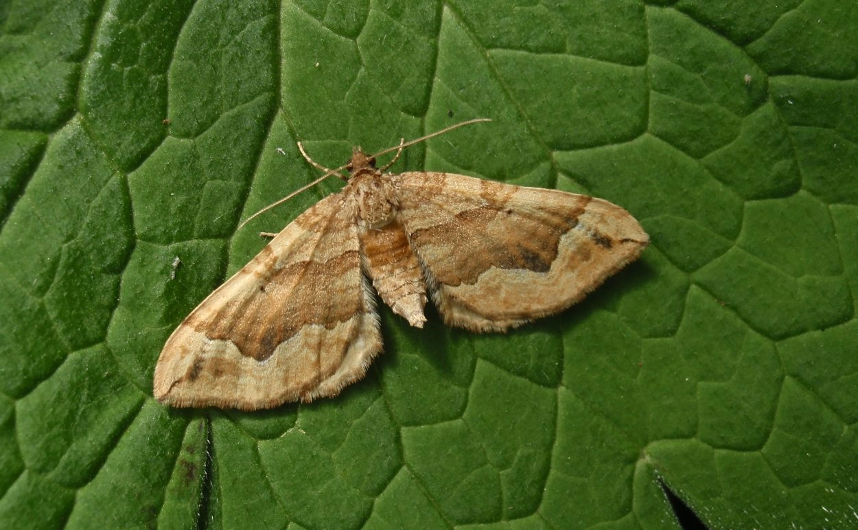 Voorvleugellengte: 16-18 mm. De bruinachtig gele of lichtbruine voorvleugel is breed en tamelijk afgerond van vorm; de vleugelpunt is enigszins spits. De middenband is donkerder van kleur en heeft halverwege een duidelijke uitstulping, meestal in de vorm van een stompe punt. De middenband bestaat uit verschillende zones die naar het midden toe steeds lichter worden en die gemarkeerd zijn door gegolfde randen. In de lichtste zone bevindt zich een kleine donkere middenstip. De tekening varieert slechts in kleine details.
