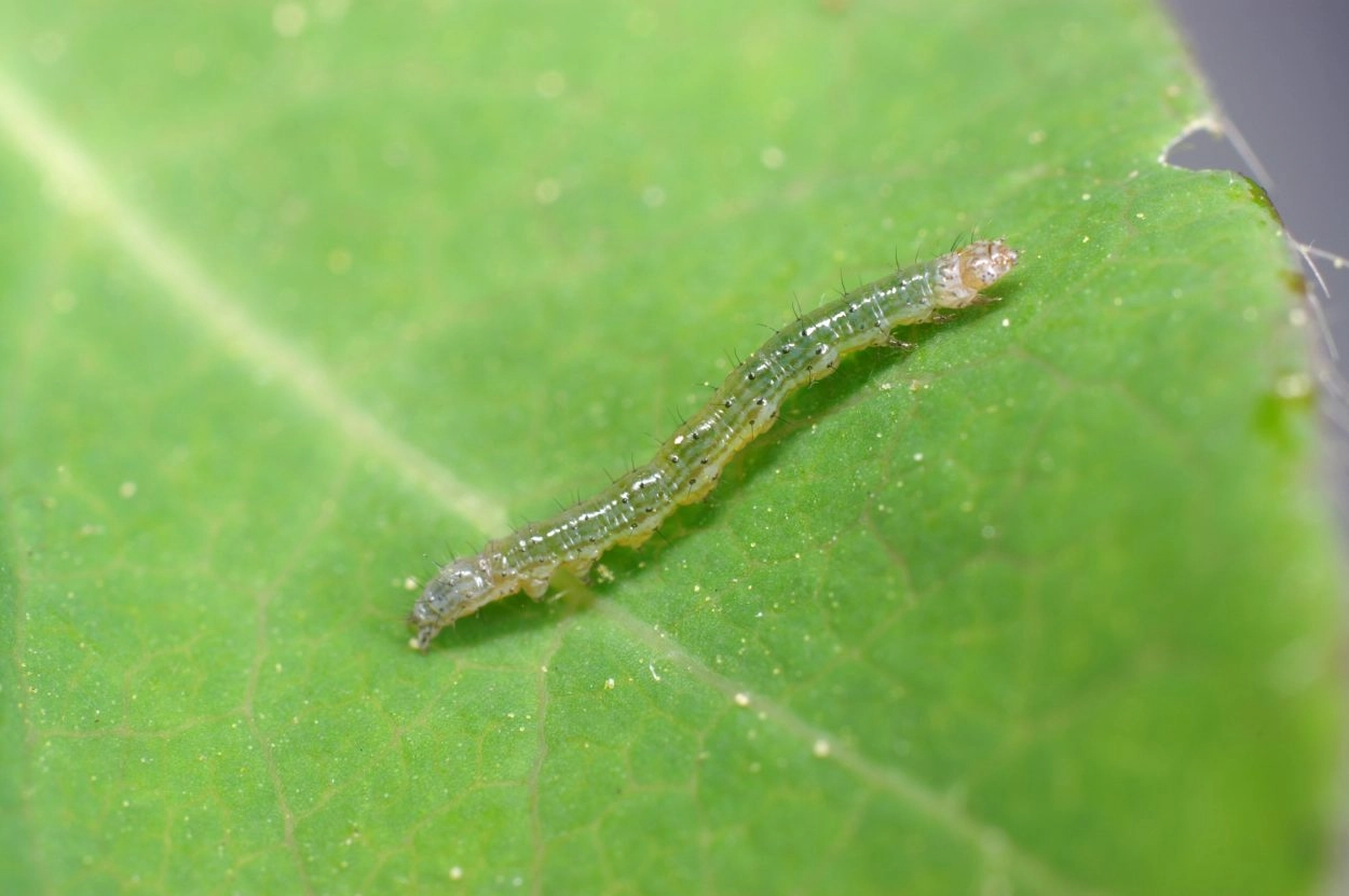 Tot 40 mm; slank, versmald naar beide uiteinden; lichaam okerkleurig tot lichtgrijs met over de rug een lichtbruine tot witachtige middenstreep, die op segment zeven door een vierkante, zwartachtige vlek wordt onderbroken; witte vlekjes met zwarte rand; onder de spiracula een lichte lengteband; kop lichtgrijs of bruin.