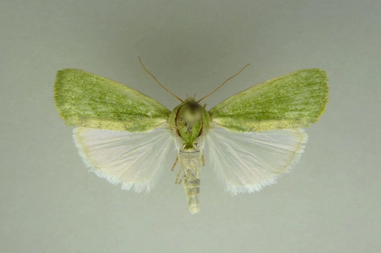 Voorvleugellengte: 10-12 mm. Houdt in rust de vleugels onder een scherpe hoek in dakvorm. De voorvleugel heeft een doorgaans groene, soms ook bruingroene of licht grijsbruine kleur met vaag zichtbare, evenwijdig aan elkaar lopende donkere V-vormige dwarslijnen (waarvan het korte deel op de buitenste vleugelhelft vaak nauwelijks te zien is). Soms ligt er tussen twee van deze dwarslijnen een donker paarsachtig bruine zone waardoor er in rusthouding een opvallende bandvormige V over de beide vleugels is te zien. Een donkere vleugelzoom ontbreekt en de franje is doorgaans licht tot witachtig groen. De achtervleugel is wit.