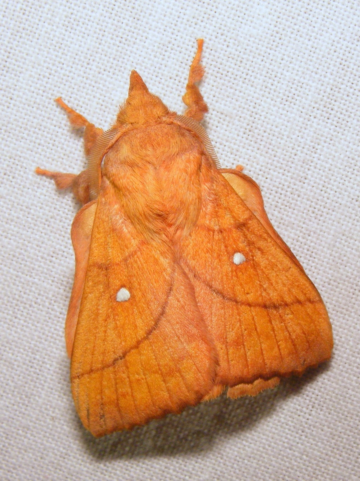 Voorvleugellengte: ♂ 22-25 mm, ♀25-30 mm. Deze spinner is goed te herkennen aan de roodachtig geelbruine voorvleugel met een duidelijke scherp afstekende witte middenvlek. De zwartachtige centrale dwarslijnen steken eveneens duidelijk af en zijn fraai regelmatig gebogen. De dunnere roodachtig bruine golflijn is geschulpt. Vooral in het zoomveld vallen de donkere aderlijnen op. De achterranden van de vleugels zijn fijn gekarteld. De achtervleugel is iets lichter van kleur dan de voorvleugel en soms zijn daarop twee onduidelijke dwarslijnen zichtbaar. Ook bij deze spinner steekt de achtervleugel in rust vaak iets onder de voorvleugel uit. Beide geslachten hebben geveerde antennen, maar die van het mannetje zijn sterker geveerd dan die van het vrouwtje.