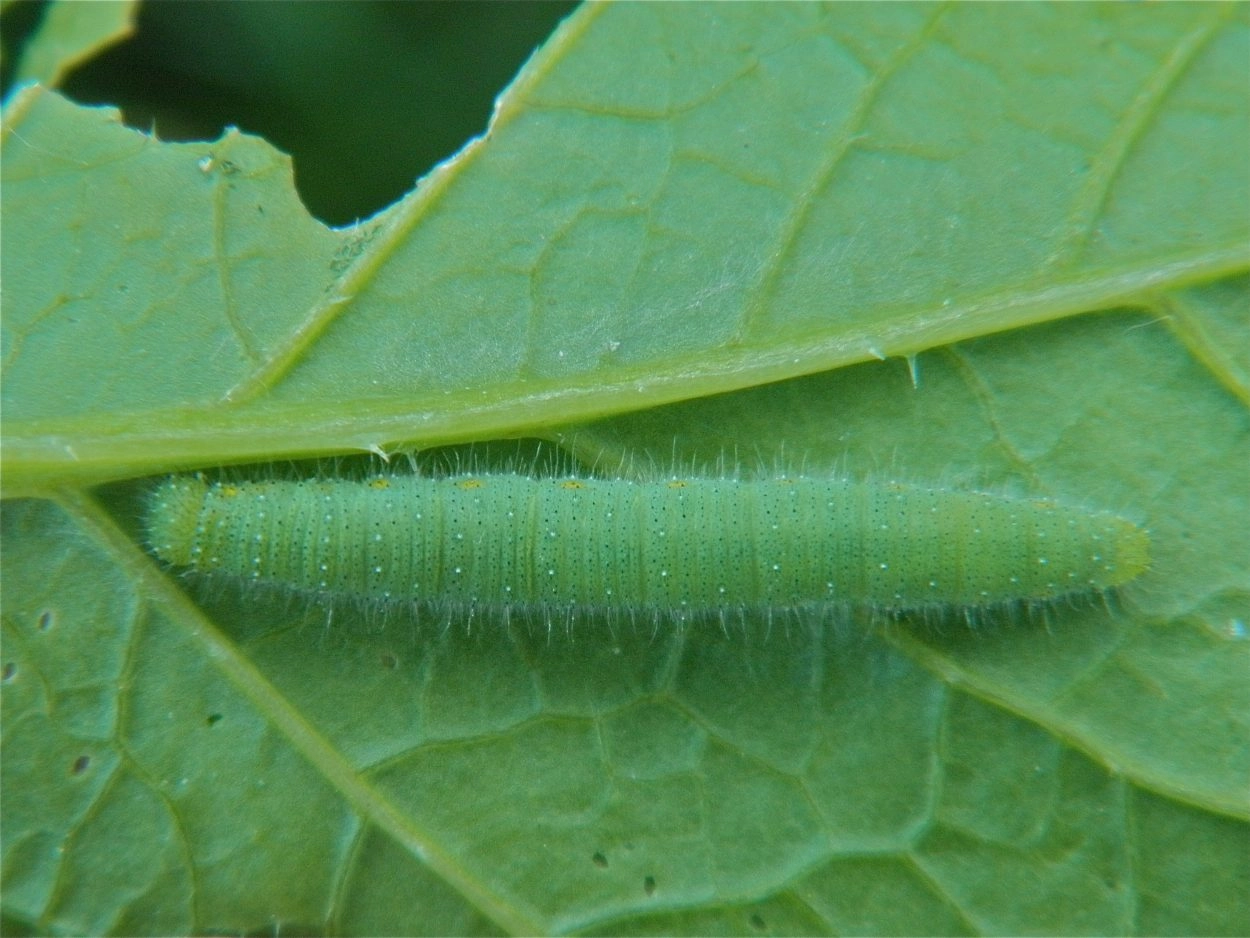 Tot 25 mm; lijkt op de rups van P. rapae maar mist de gele rugstreep en heeft zwarte spiracula die elk in een afzonderlijk geel vlekje liggen.