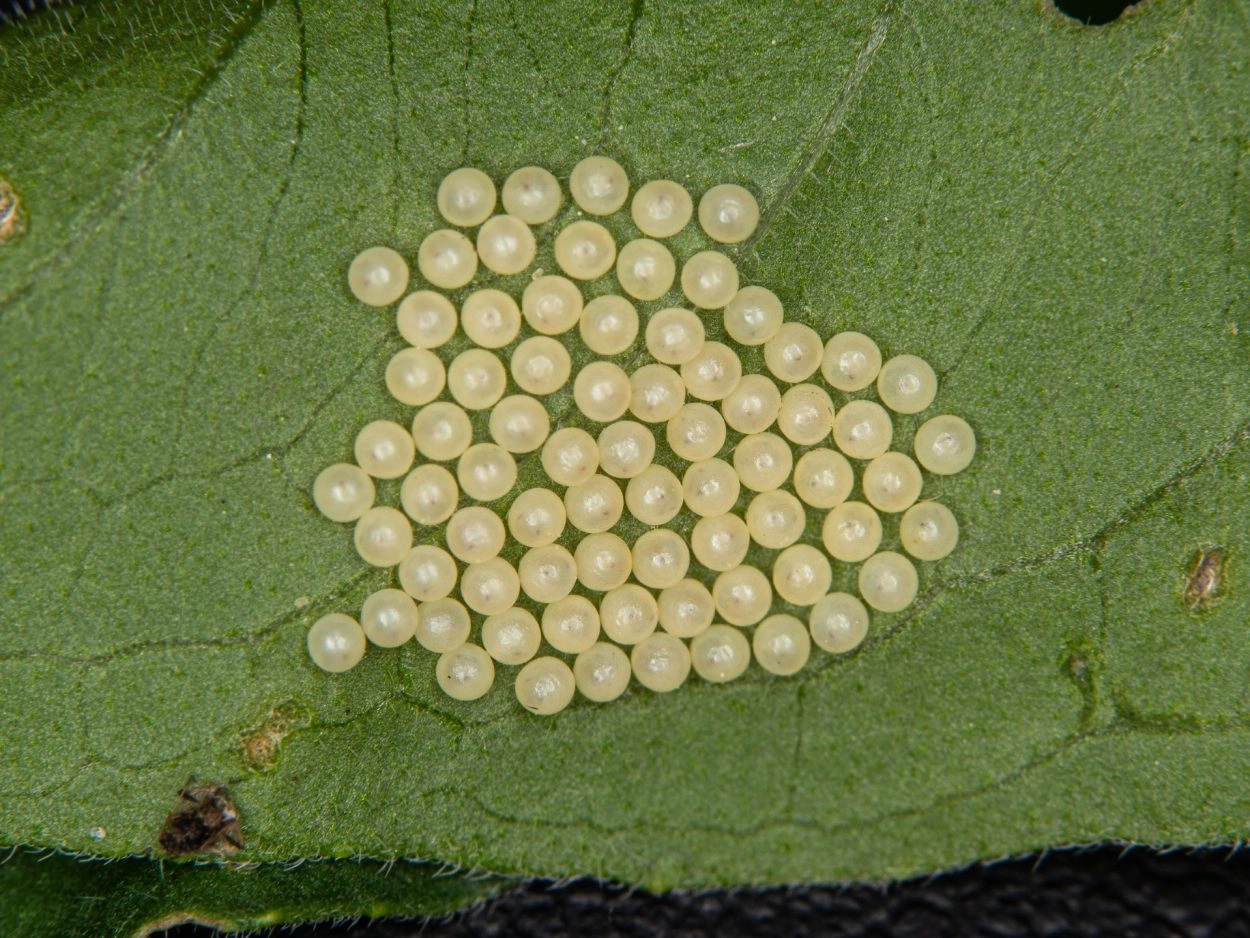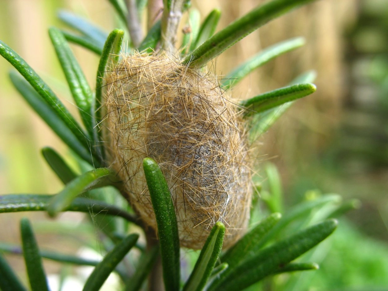 Tot 35 mm; lichaam fluweelzwart, bekleed met dichte, zwartachtig bruine of roodachtig bruine haarborstels op kleine verheven wratjes; spiracula klein, witachtig; kop glimmend zwart.