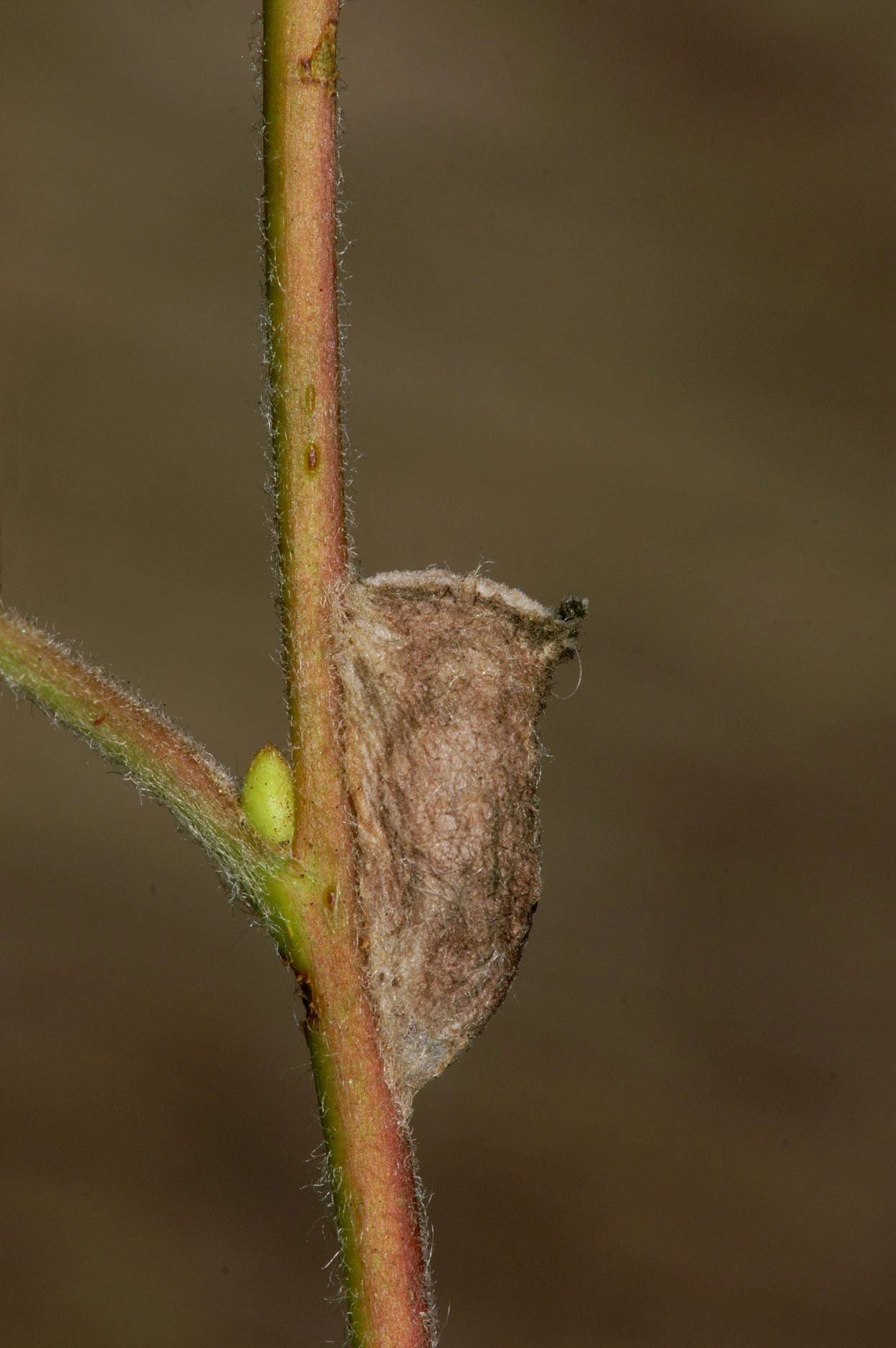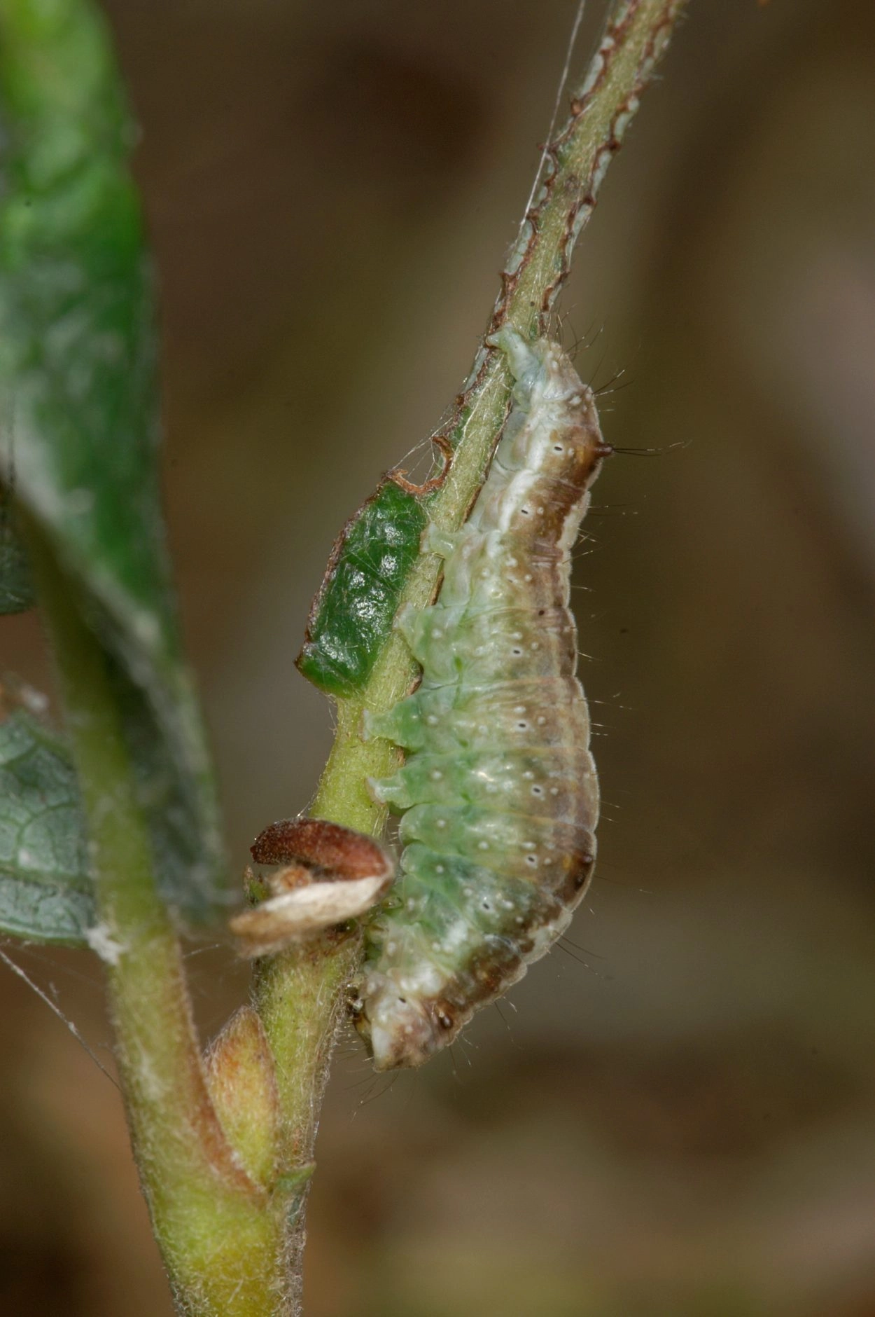 Tot 19 mm; kort en plomp, naar de staart toe versmald; lichaam witachtig, soms met een roze zweem en bruine lengtestrepen over rug en flanken; onderzijde licht blauwachtig groen; op de rugzijde van de segmenten vijf en elf een paar donkerbruine, verheven wratten; spiracula zwart; kop lichtgroen, soms in het lichaam teruggetrokken.