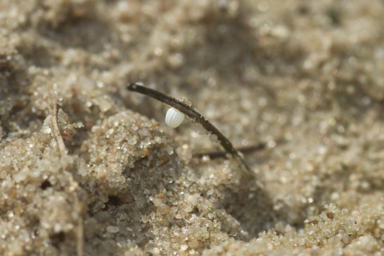 Na de bevruchting duurt het iets minder dan een week voordat de eitjes rijp zijn. Voor het afzetten van de eitjes kiest het vrouwtje polletjes gras die groeien in een zeer lage en open vegetatie met (korst)mossen en hier en daar wat open zand. De eitjes worden afzonderlijk op de waardplant afgezet.