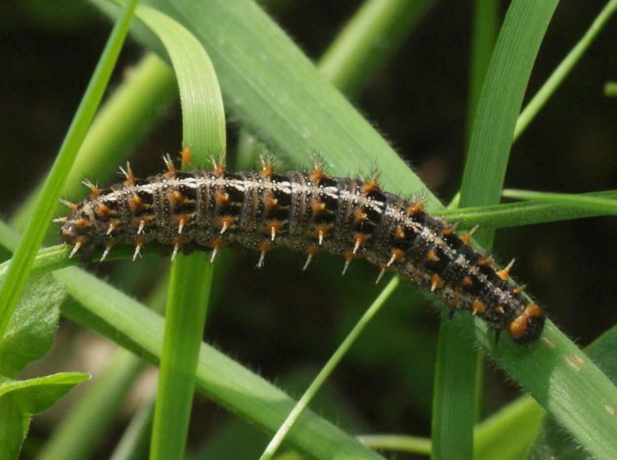 Tot 35 mm; lichaam zwart met fijne witte spikkeltjes en bruine tekening, over de rug een dubbele witte lengtestreep; doorns roodachtig bruin; buikpoten geelachtig bruin; kop bruin met zwarte tekening.
