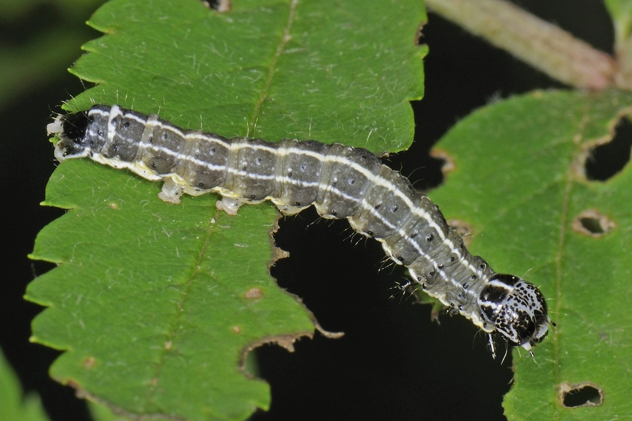 Tot 30 mm; lichaam groen of bruin; de groene vorm met witte spikkels en gele ringen tussen de segmenten; over de rug een witte middenstreep en langs de spiracula een brede, witte lengteband met groene of roze zweem. De bruine vorm heeft duidelijke, zwarte vlekken; over de rug een brede witte middenstreep met aan weerszijden een smallere witte lengtestreep; beide vormen hebben op het elfde segment een brede witte dwarsstreep over de rugzijde; kop groenachtig of okerachtig wit met donkerder stippen.