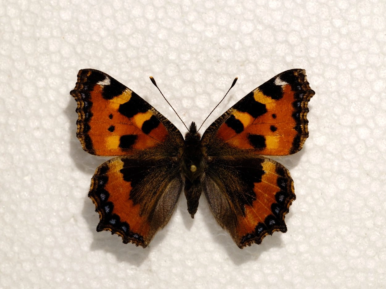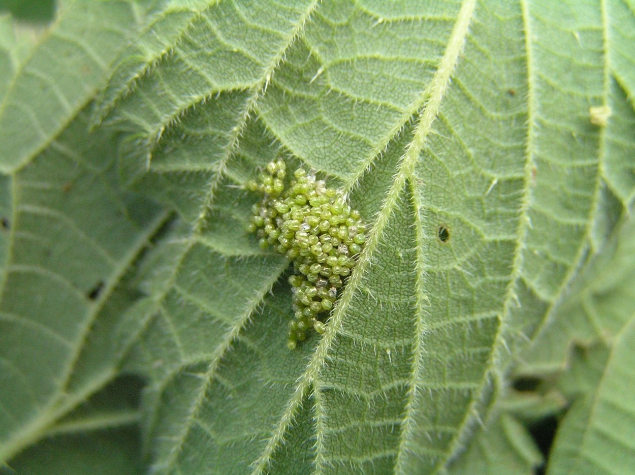 Het vrouwtje zet de eitjes bij voorkeur af op jonge brandnetels die groeien op open, zonnige plaatsen. Om een geschikte plant te vinden, gebruikt zij zintuigen die liggen op het onbehaarde gedeelte van haar voorste poten, de poetspoten. Ze zoekt in de namiddag een geschikte bos brandnetels uit waarop ze overnacht. De volgende ochtend blijft zij daar in de buurt en wisselt het zonnen af met korte vluchten. Zodra de temperatuur hoog genoeg is, wordt één groepje van enkele tientallen tot honderden eitjes afgezet op de onderzijde van een blad. Als het vrouwtje tijdens het leggen van de eitjes wordt verstoord, vliegt ze weg maar keert later terug om de afzet te voltooien.
