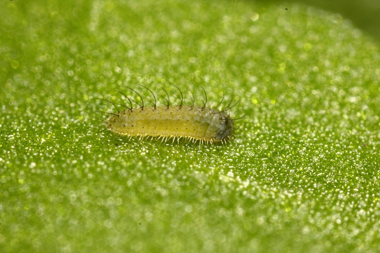 Tot 15 mm; kort en plomp, versmald naar de uiteinden; lichaam groen met een roze purperachtige rugstreep en een overeenkomstige streep onder de spiracula; de aanwezigheid en intensiteit van de roze-achtige tekening is bijzonder variabel; kop bruinachtig groen en in het lichaam teruggetrokken.