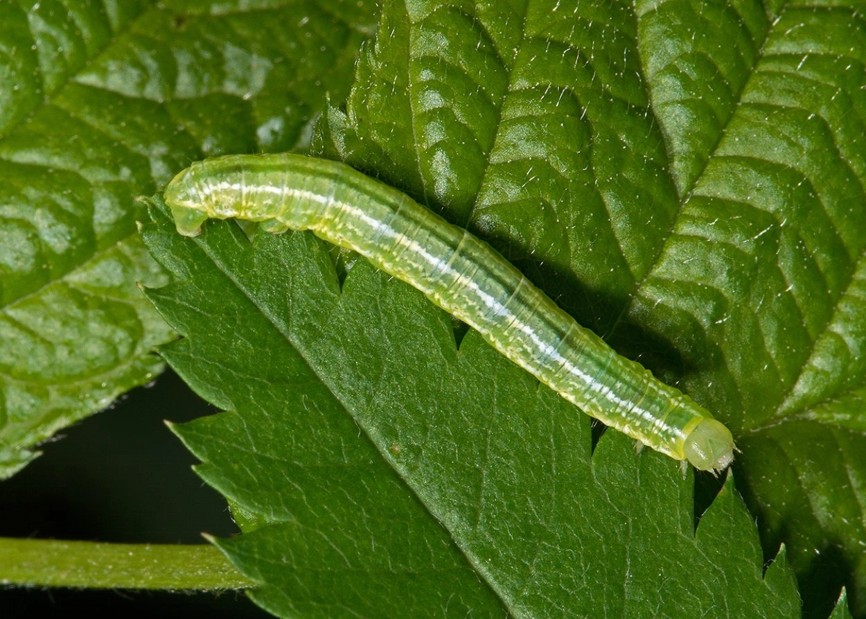 Tot 20 mm; lichaam blauwachtig groen, geelachtig groen of groenachtig grijs, gewoonlijk over de rug een donkere middenstreep met aan weerszijden daarvan twee geelachtig witte lengtestrepen, waarvan de buitenste streep gebroken en onregelmatig is; over of iets onder de spiracula een geelachtig witte lengtestreep; veel exemplaren hebben smalle, gele ringen tussen de segmenten; kop bleek groenachtig bruin met donkerbruine tekening.
