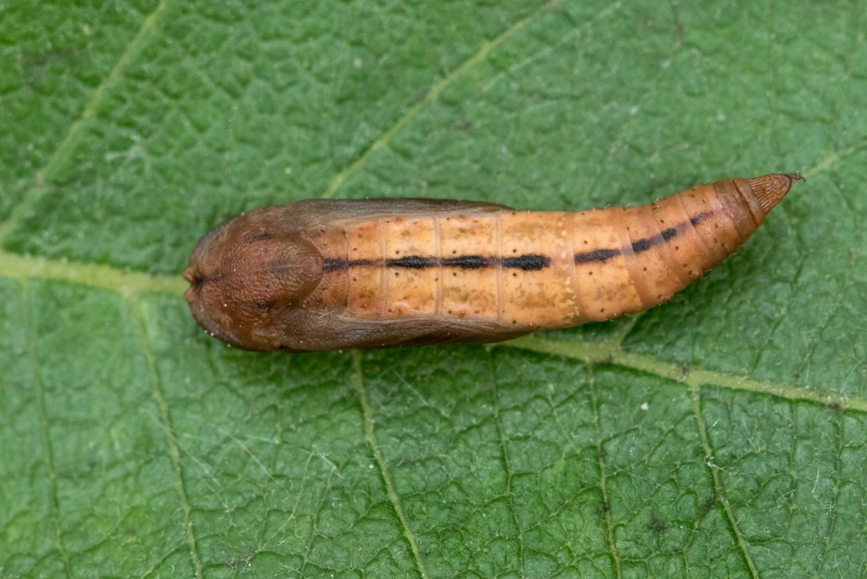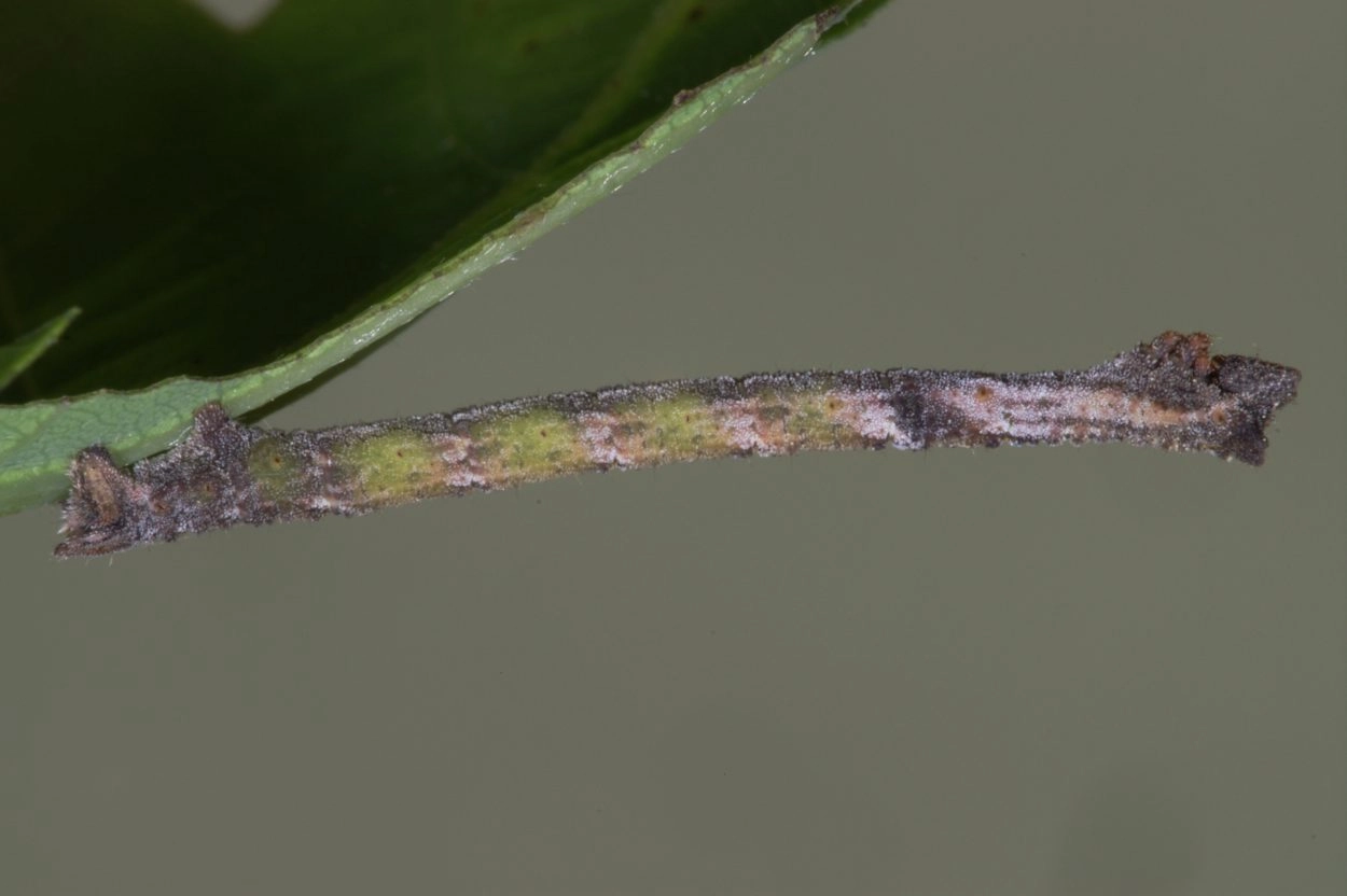 Tot 23 mm; lang en dun; lichaamsoppervlak ruw, geelachtig groen en getooid met roodachtig bruine, V-vormige tekeningen over de rug; het eerste segment van de thorax draagt een paar uitsteeksels gelijk aan die van de diepingesneden kop. Er is ook een bruine vorm met witte tekening op de rug.