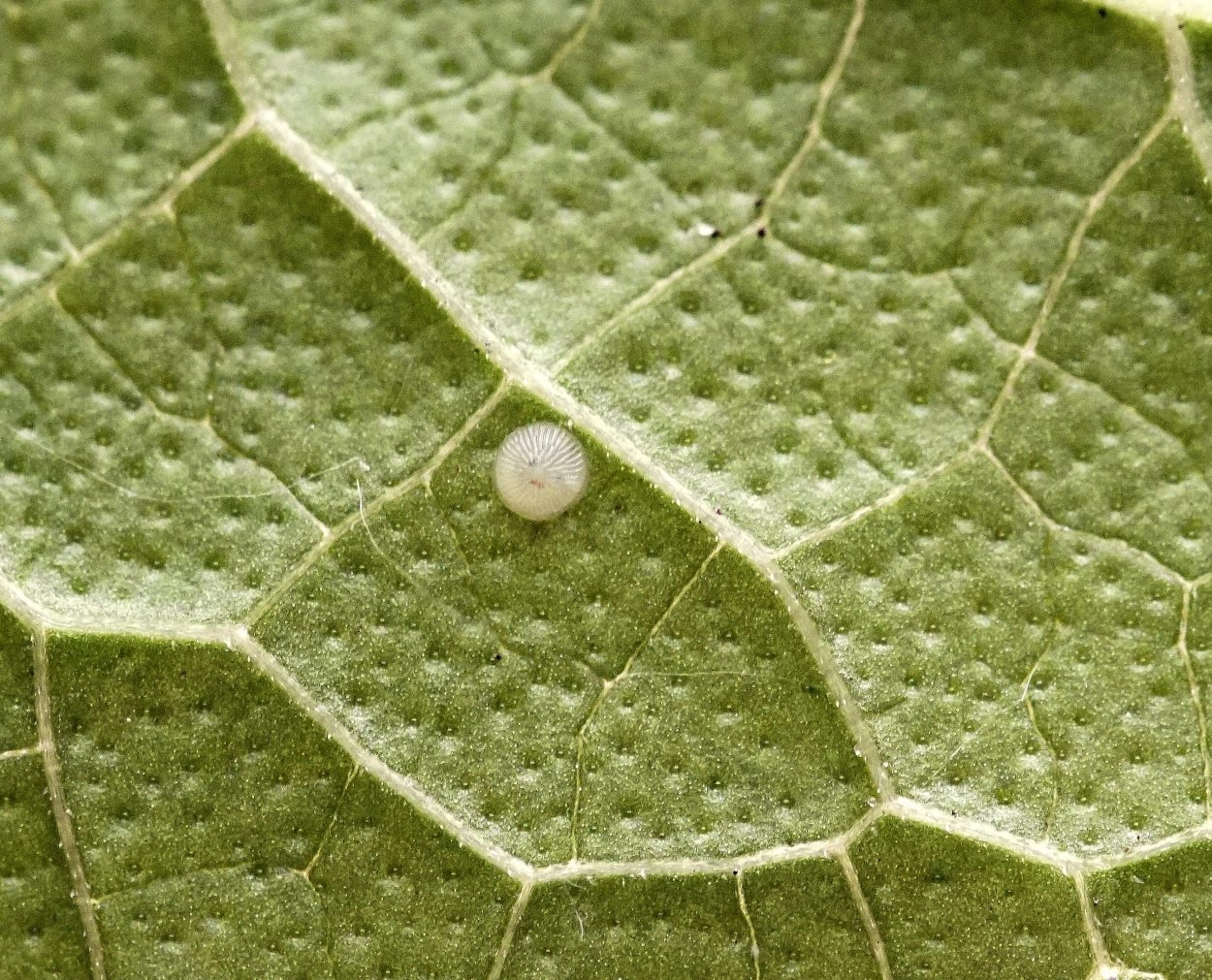 Tot 35 mm; een 'semi-spanrups' met slechts twee paar buikpoten; lichaam bleek blauwachtig groen met over de rug een rij witachtige, pijlvormige vlekken en langs de zwartgerande spiracula een witachtige lengtestreep; kop geelachtig groen.