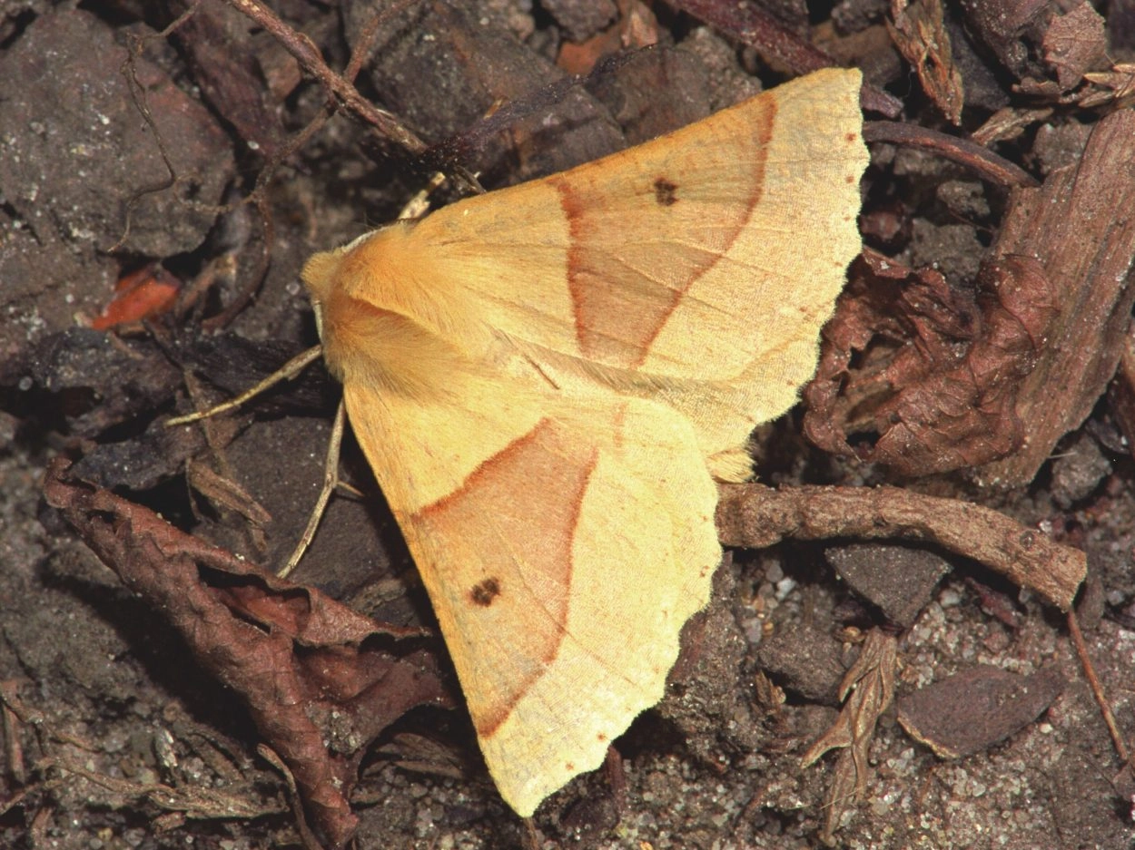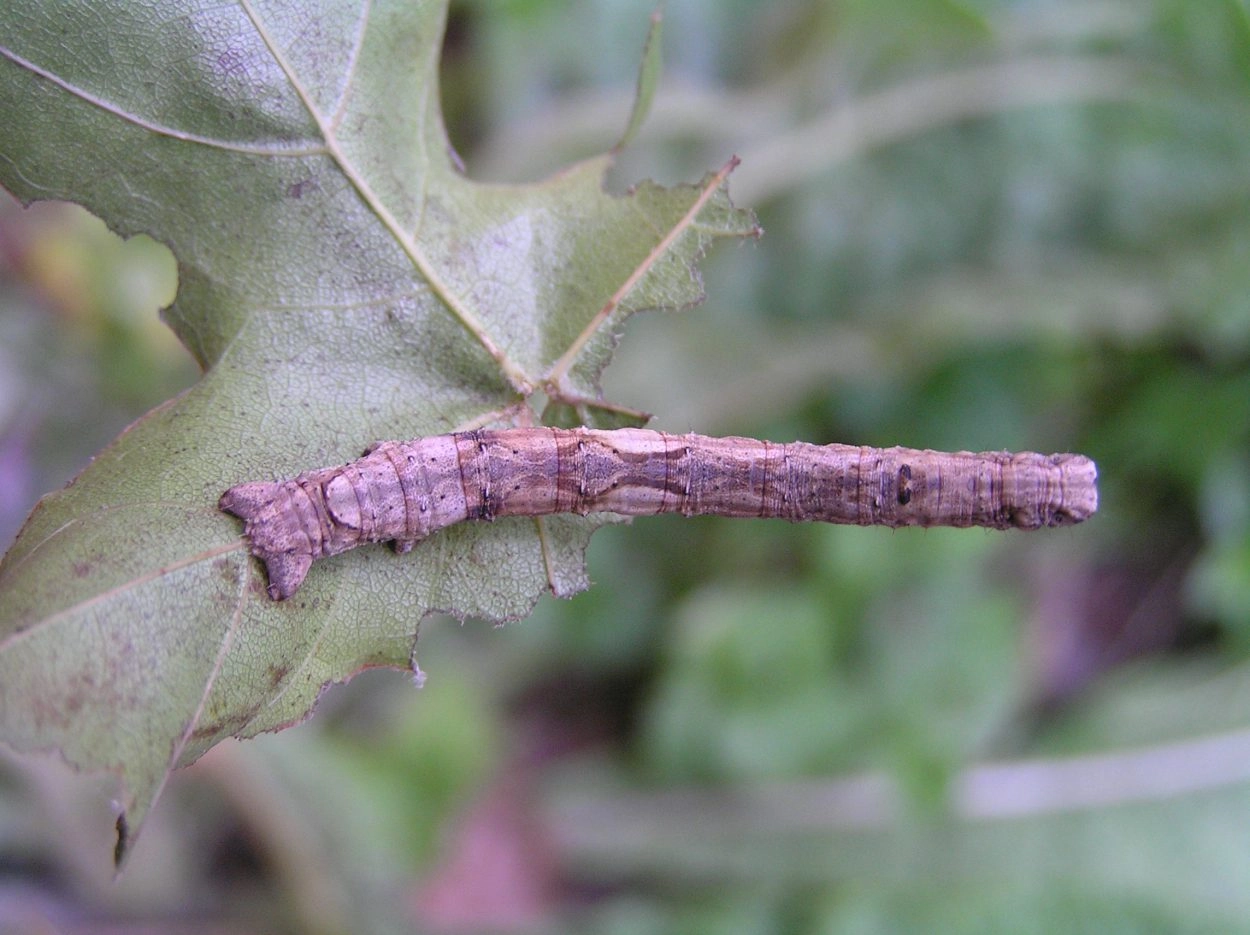 Getande spanner (Odontopera bidentata).N.B.: vergelijk behalve de uiterlijke kenmerken ook de tijd van het jaar waarin de rupsen voorkomen, het habitat en de waardplant(en).