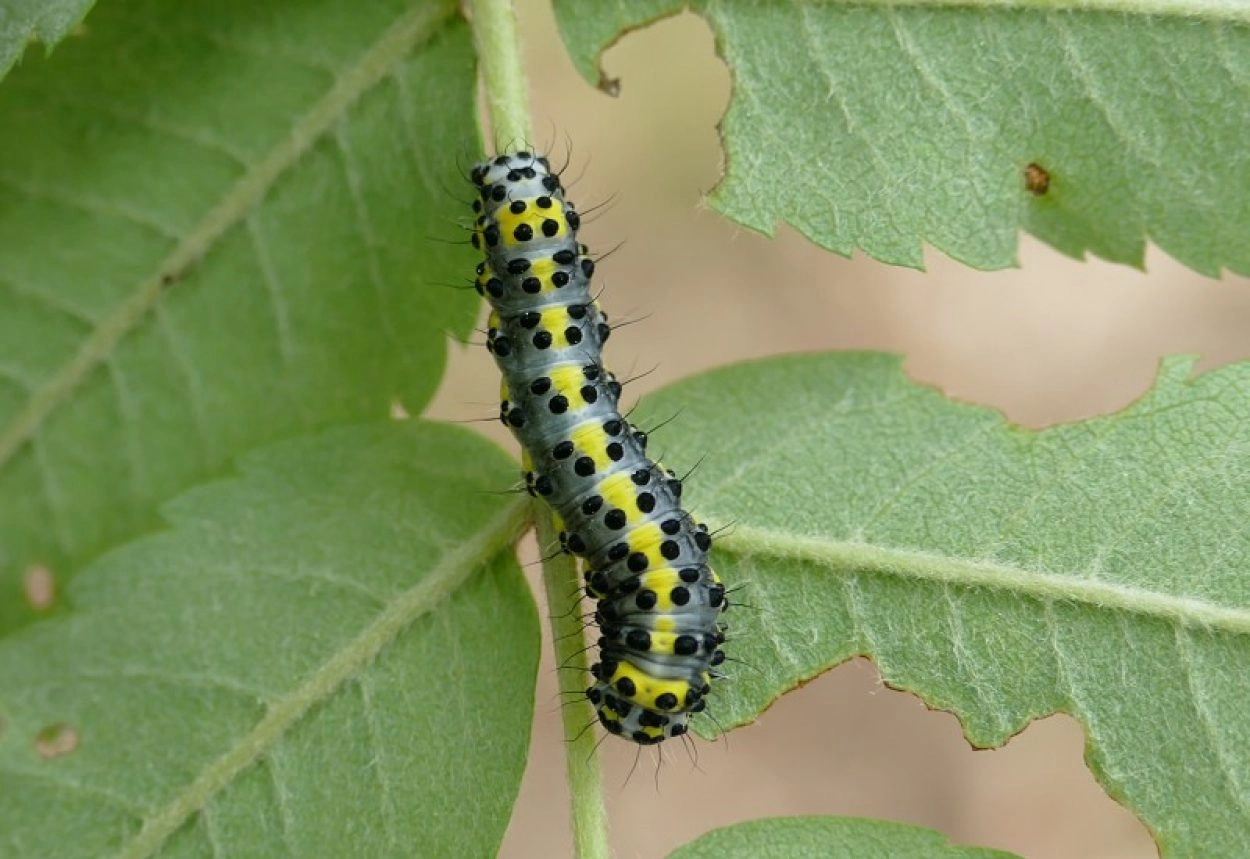 Tot 40 mm; lichaam varieert in kleur van licht blauwachtig grijs tot leigrijs met verheven zwarte vlekken; over de rug een gebroken, diepgele middenstreep en een identieke streep over de spiracula; kop grijsachtig wit met zwarte vlekken.