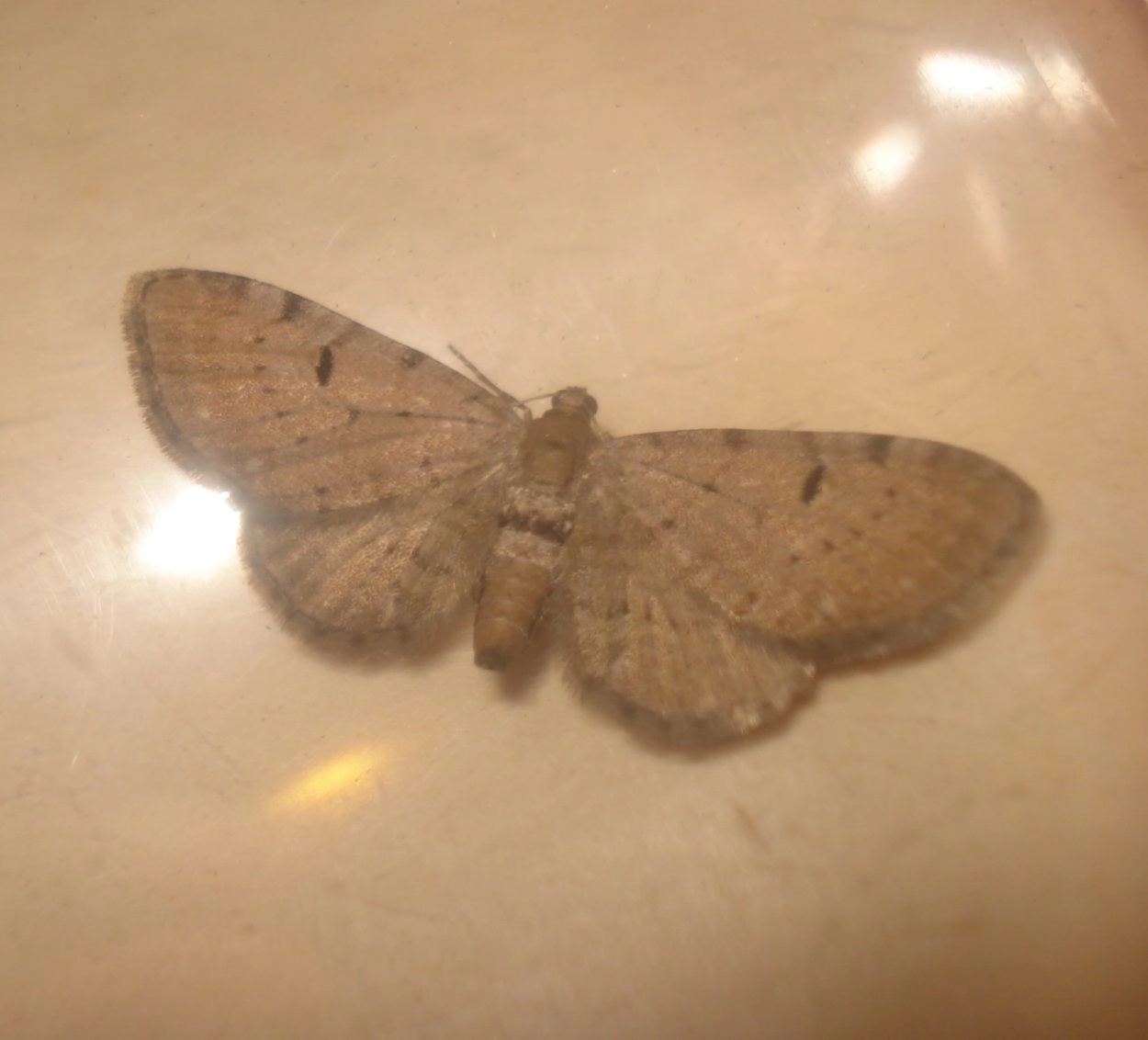 Voorvleugellengte: 12-13 mm. Een grote, lichtgekleurde rozeachtig bruine dwergspanner met een brede en afgeronde voorvleugel. Langs de voorrand bevinden zich drie of vier opvallende zwarte vlekken, de middenstip is groot en langgerekt en de lichte vlek in de binnenrandhoek is nauwelijks zichtbaar of zelfs afwezig. De centrale dwarslijnen bestaan uit rijen zwarte stippen. De franje is zwak geblokt en op het achterlijf bevindt zich een zwarte band.
