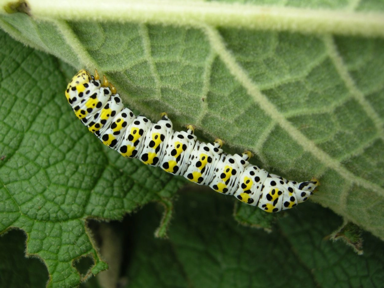 Tot 50 mm; lichaam groenachtig wit tot bleek blauwachtig groen met over de rug een rij gele dwarsbanden, elk met een karakteristiek patroon van zwarte strepen en vlekken; eveneens zwarte vlekken onder de lijn van de spiracula; kop geel met zwarte vlekjes.