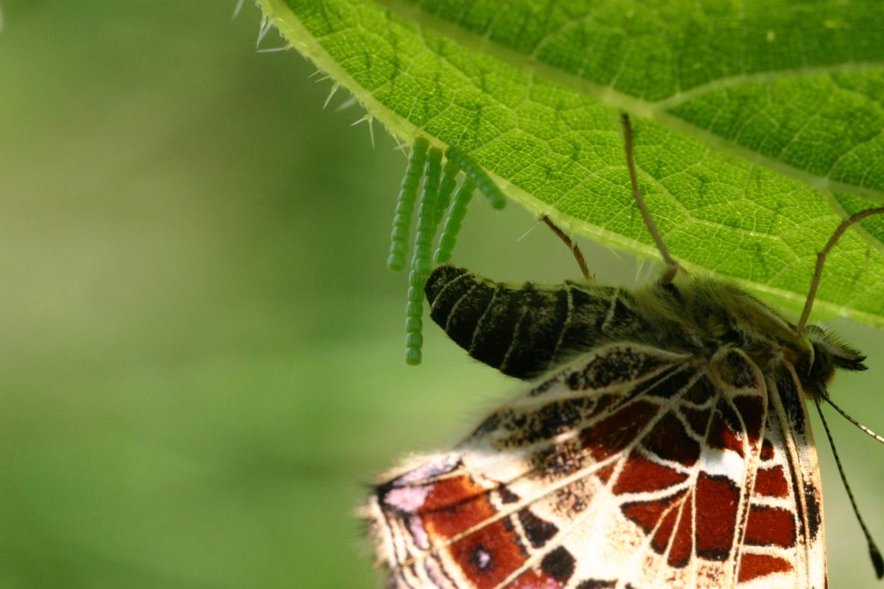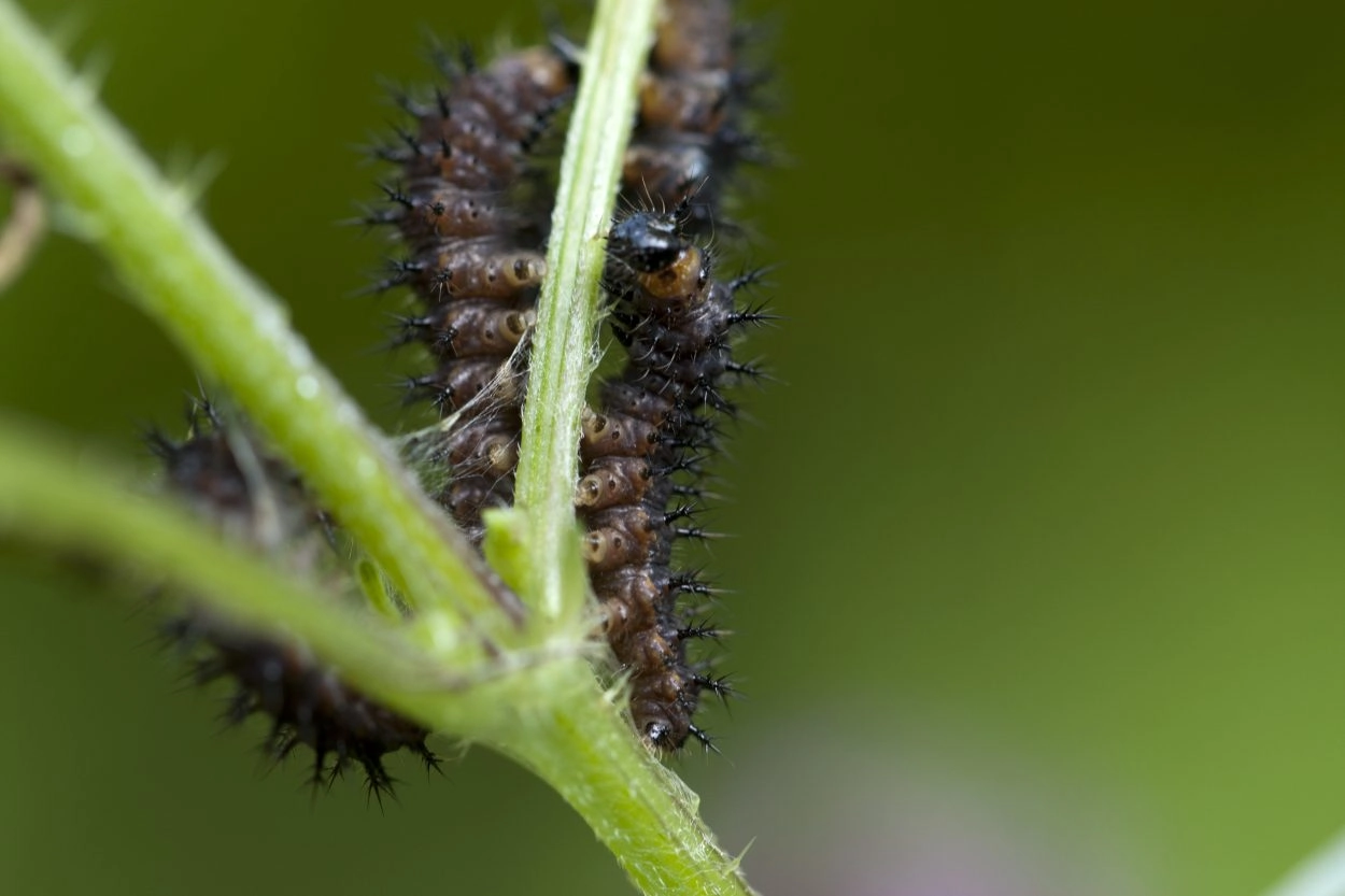 Rups: eind mei-begin juli en begin augustus-half september. Jonge rupsen leven in grote groepen bijeen in rupsennesten, volwassen rupsen leven solitair. De soort overwintert als pop, hangend aan een stengel in de kruidlaag. Eiafzetting vindt plaats in de vorm van korte kettinkjes (tot 10 eitjes per streng) onder brandnetelbladeren.