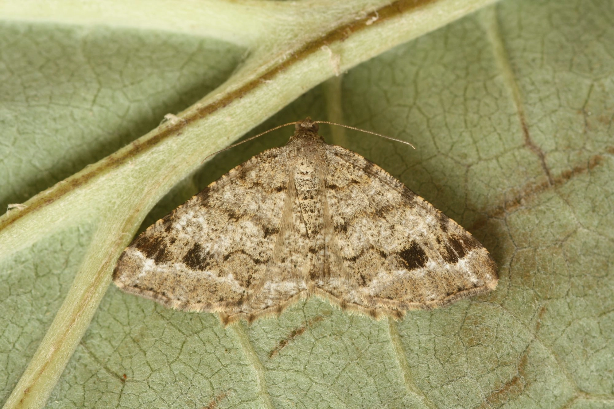 Voorvleugellengte: 13-14 mm. Een spanner met dicht bespikkelde, vuilwitte vleugels. Op de voorvleugel bevindt zich, iets naast het midden, een min of meer vierkante vlek en langs de voorrand drie uitwaaierende donkere vlekken. De achtervleugel is enigszins puntig.