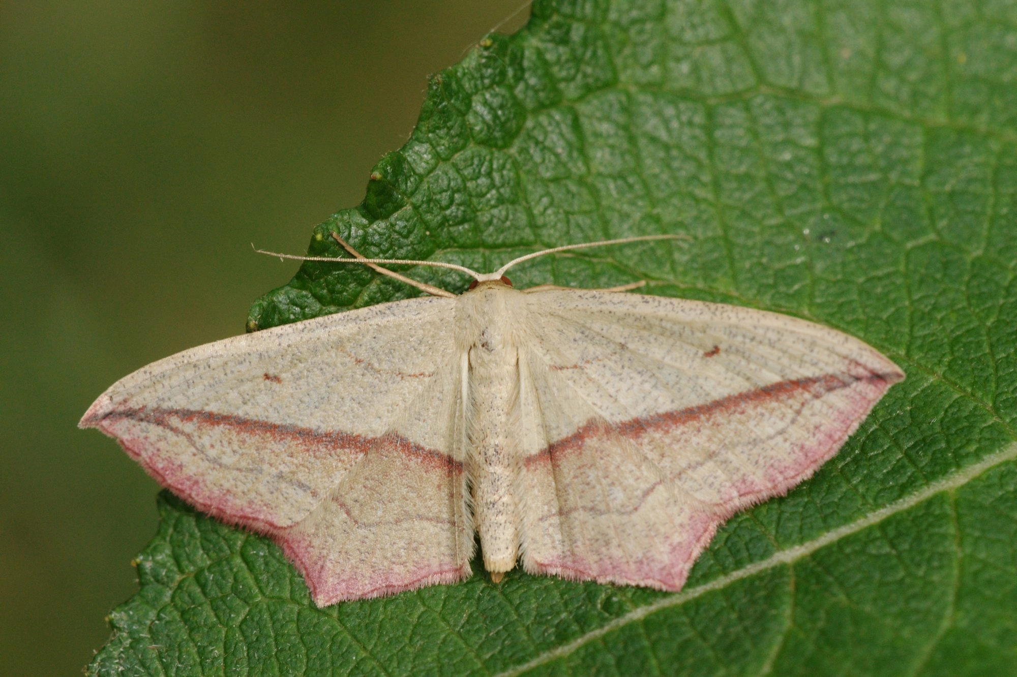 Voorvleugellengte: 15-18 mm. Gemakkelijk te herkennen aan de rozerode of roodachtig bruine diagonale lijn die vanuit de vleugelpunt schuin over de voorvleugel naar de binnenrand loopt en doorloopt over de achtervleugel. Ook de helder rozerode achterrand van de vleugels is kenmerkend. De grondkleur van de vleugels is roomkleurig bruin met een variabele zeer fijne donkere spikkeling. De achtervleugel heeft halverwege de achterrand een duidelijke punt. De rozerode tinten kunnen in de loop van de vliegtijd verbleken waardoor het bruin gaat overheersen; de tekening varieert weinig. Zeer zelden worden donkerbruine of purperachtig zwarte exemplaren waargenomen. Exemplaren van de eerste generatie zijn groter dan die van de tweede generatie; vlinders van de derde generatie zijn witter met een grovere spikkeling.