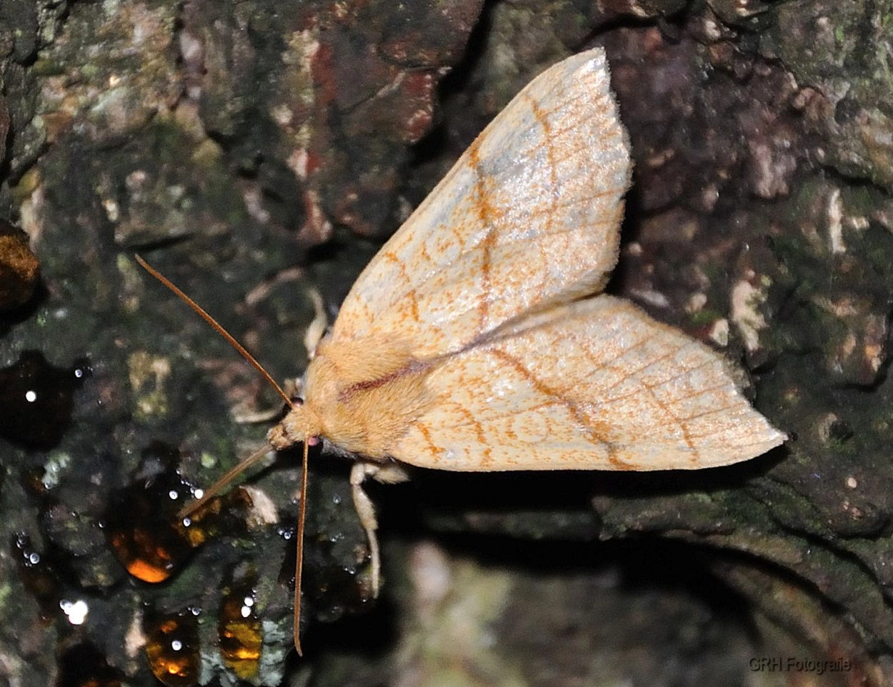 Voorvleugellengte: 15-17 mm. De brede puntige oranjegele voorvleugel is fijn bespikkeld met oranjerood (soms bruin); de aders hebben dezelfde kleur als de spikkels. Opvallend zijn de oranjerode binnenste en buitenste dwarslijn en de vrij brede middelste dwarslijn. Deze middelste dwarslijn loopt diagonaal tussen de ringvlek en de niervlek door, waarbij de niervlek geraakt wordt; dit is een kenmerkend patroon. De kleur van de vleugel, de hoeveelheid spikkels en de intensiteit van de dwarslijnen en aders kunnen variëren.