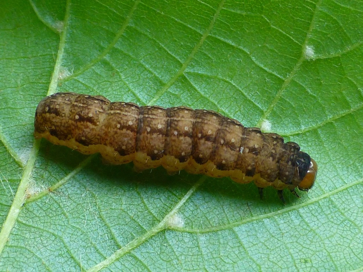 Tot 35 mm; lichaam groenachtig bruin tot purperachtig of donker grijsachtig bruin met witachtige spikkels; over de rug een bleke middenstreep met aan weerszijden een rij min of meer duidelijke, zwarte vlekjes; onder de spiracula een brede lichtbruine of witte lengteband; onderzijde lichtgrijs of bruin; kop bruin.