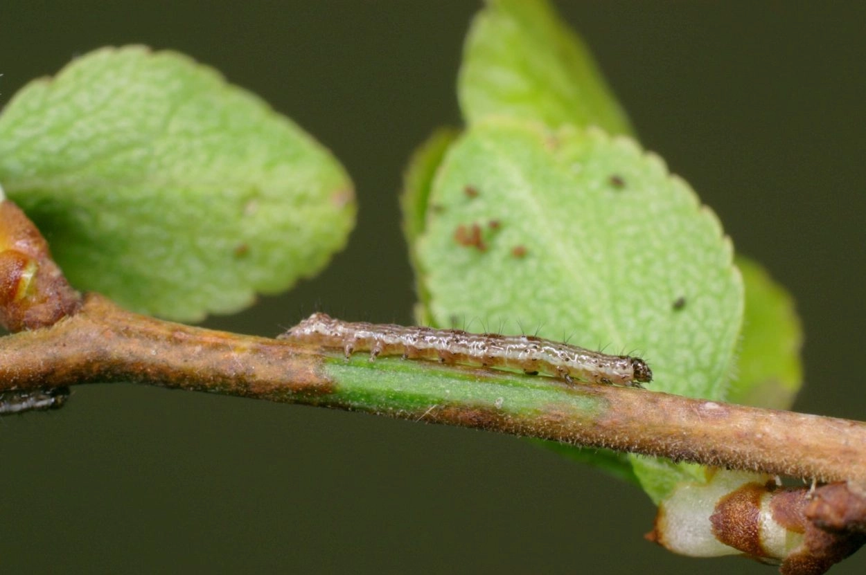 Tot 45 mm; vrij slank; met op het elfde segment een achterwaarts gerichte bult waarop vier kleine punten staan; kleur van het lichaam zeer variabel van bruin tot purperachtig grijs of grijsachtig groen; op de rug een ingewikkeld patroon van ruitvormige vlekken dat op segment vier door twee lichte, schuine strepen wordt onderbroken; op de flanken een rij gebroken golflijntjes met zwarte omtrek; onderzijde witachtig; kop witachtig met een zwartachtige dwarsband en andere donkere tekening.