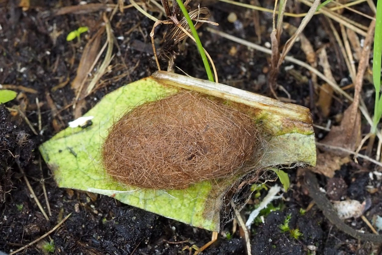 Tot 40 mm; lichaam grijsachtig bruin, bekleed met geelachtig bruine haarborstels op kleine, donkere, verheven wratjes; soms met sporen van een bleke middenstreep overde rug; kop geelachtig bruin.