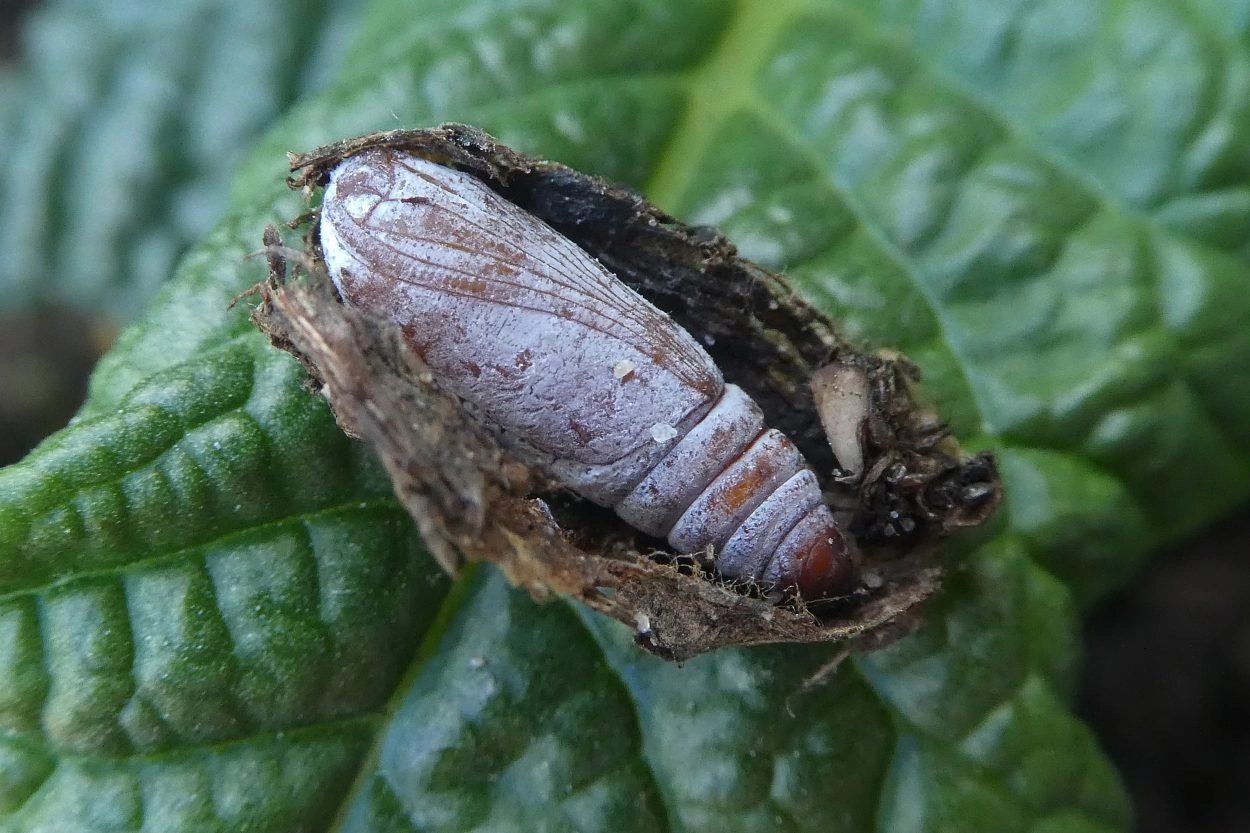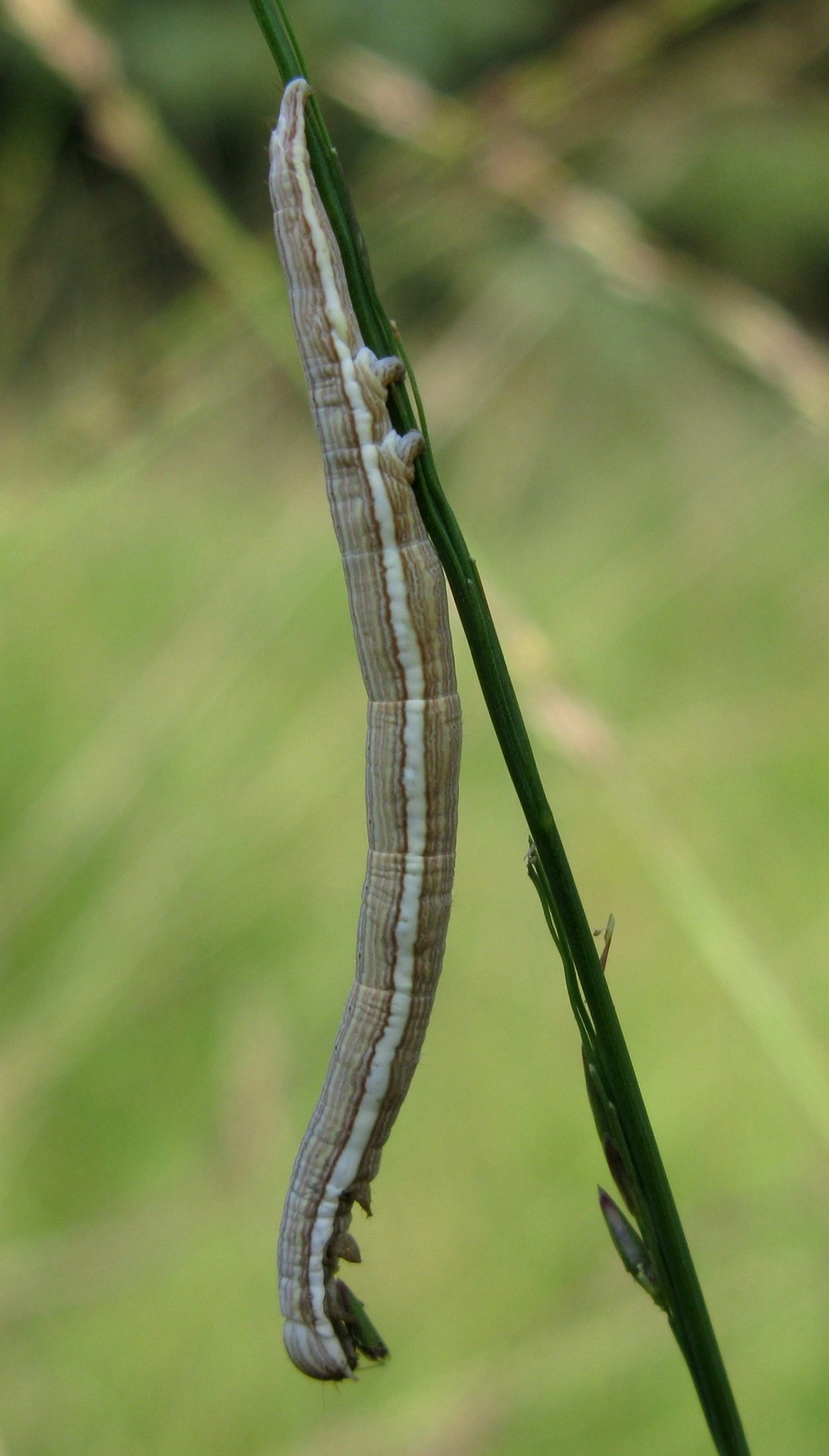Tot 40 mm; lang en slank; een 'semi-spanrups' met slechts drie paar buikpoten; lichaam bleek okerachtig wit of lichtgeel; over de rug een okerkleurige middenstreep met aan weerszijden twee donkere lengtestrepen; deze strepen hebben soms het uiterlijk van een aantal fijne, bruine lengtestreepjes; onder de lijn van de spiracula een geelachtig witte lengteband; kop witachtig met fijne, bruine lijntjes in het verlengde van die van het lichaam.