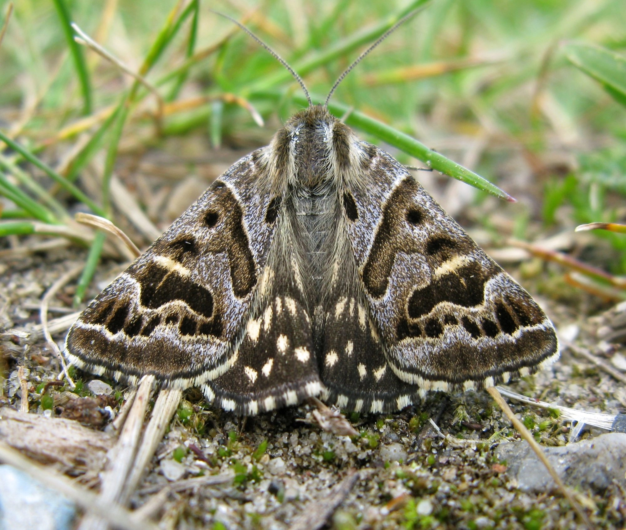 Bruine daguil (Euclidia glyphica).N.B.: vergelijk behalve de uiterlijke kenmerken ook de tijd van het jaar waarin de rupsen voorkomen, het habitat en de waardplant(en).