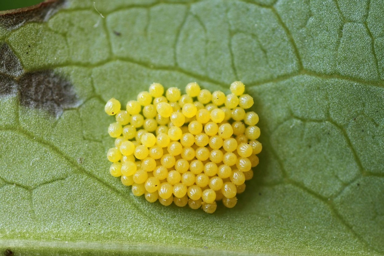 Het vrouwtje zet de eitjes in één keer af in een groep van meer dan 400 eitjes; heel soms in twee keer. Ze legt de eitjes langs de middennerf van de grotere bladeren van de waardplant; grote opvallende planten die groeien in de halfschaduw hebben de voorkeur.